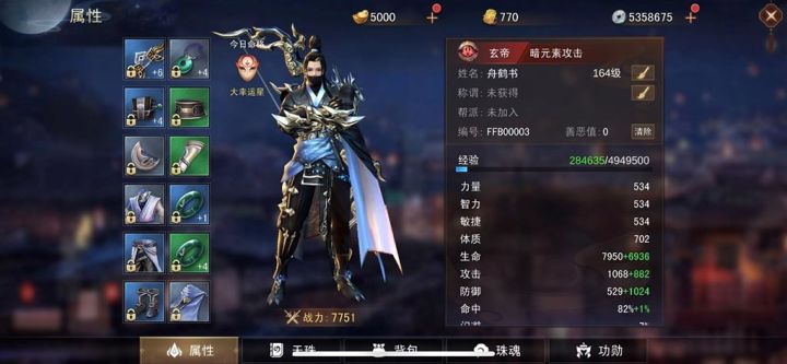 《盛唐幻夜》角色系统可以通过点击左上角【人物头像】进入角色界面,也可以通过右上角地图下方【包裹】-【属性】进入角色界面。 角色界面包括属性、天珠、背包、珠魂、功勋,5个部分:【属性】属性界面包括了装备,人物形象,角色信息三个方面,玩家可以通过属性界面浏览到对应部位穿戴的装备;在人物形象左上角可以看到玩家今日命格,命格会影响日常任务、帮派任务的品质,以及采集任务的采集数量;而在界面右端是角色属