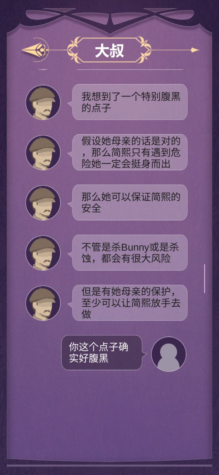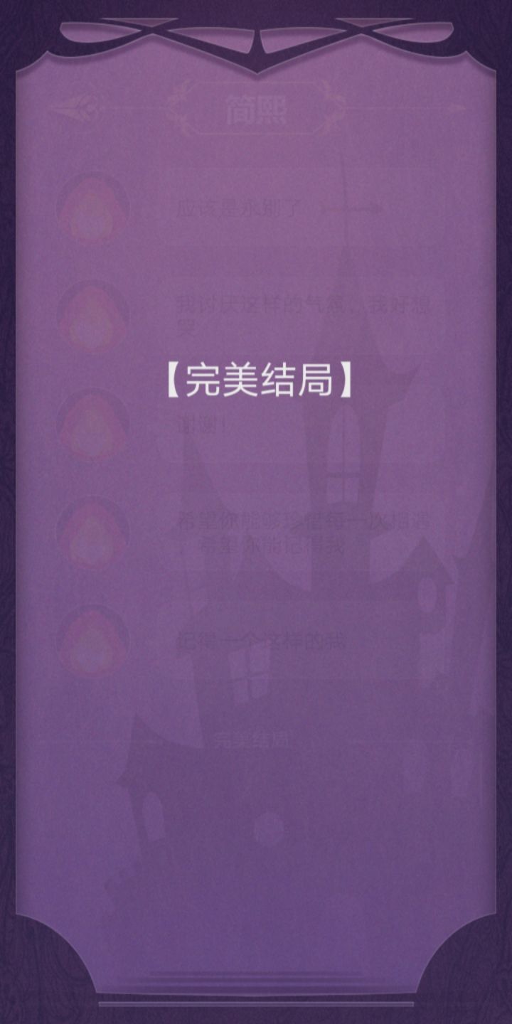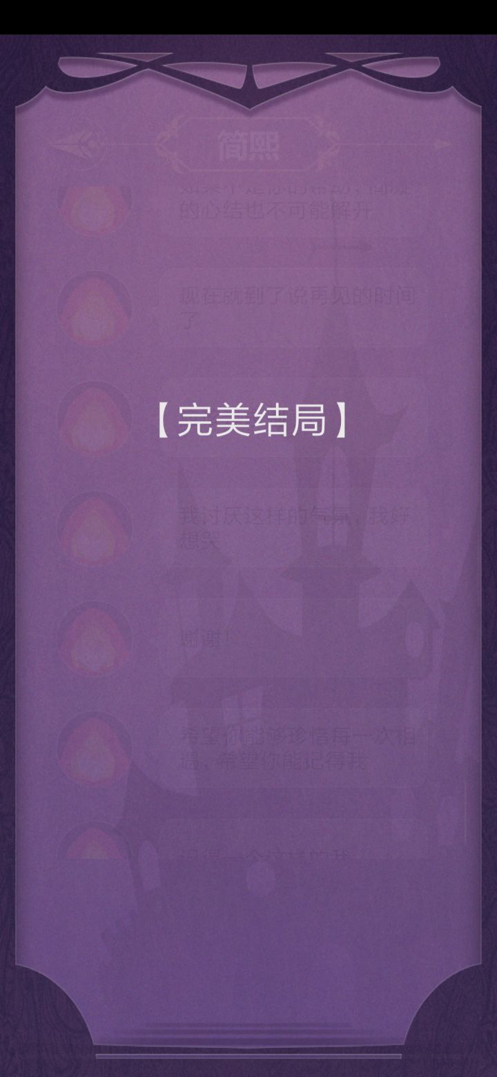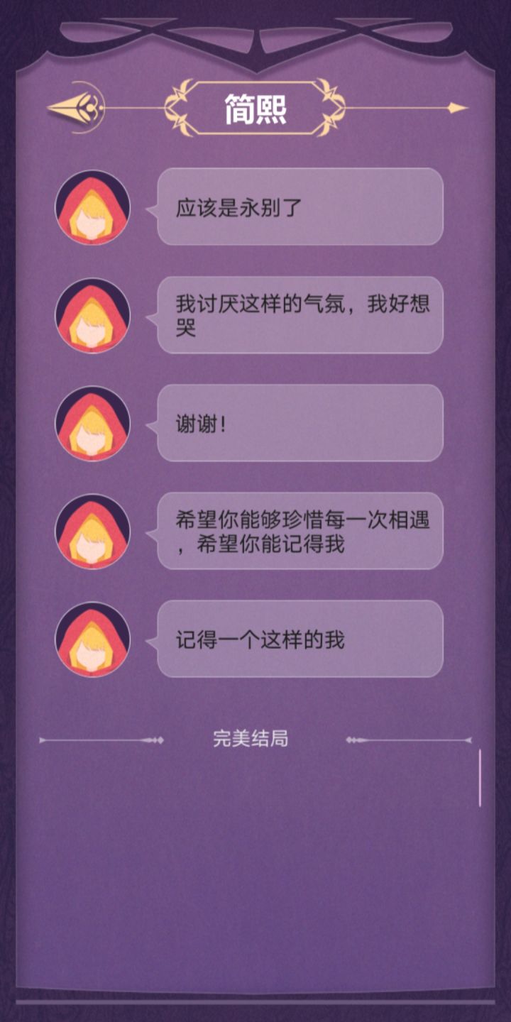 完美撒花!这个故事真的超感人!可以说是很真实、很悲伤的一个故事吧。故事需要玩家根据各个人物交流中给出的线索去进行步步推理,进而概括总结。右边的小消息框我愿称之为“人物内心独白”真的很能体现人物内心的想法。通过这个可以反向判断出人物语言的真假小tip:不要轻信任何人说的话!因为他们的立场都是片面的、不完全的,他们都是从自身出发的。这就需要玩家去设身处地得想一想了但是还是有些地方需要改进:1.简凝,简熙的人物逻辑关系在不同人物的表 述中可能有些混乱。(就有的时候我可能真的分不清哪个是姐姐,哪个是妹妹。)2.错别字。希望能好好校对一下3.关于每一条消息只能显示3行这件事。(虽然说不影响游戏进程)4.希望能添加结局墙来帮助玩家回溯剧情,亦或是从中得到启发成功get“完美结局”5.希望能添加一个大概的等待时间的提示,来给玩家一个更好的消息交互体验。这样的话也不至于出现 "简熙一睡睡两天" “大叔探路几小时”......这样的情况