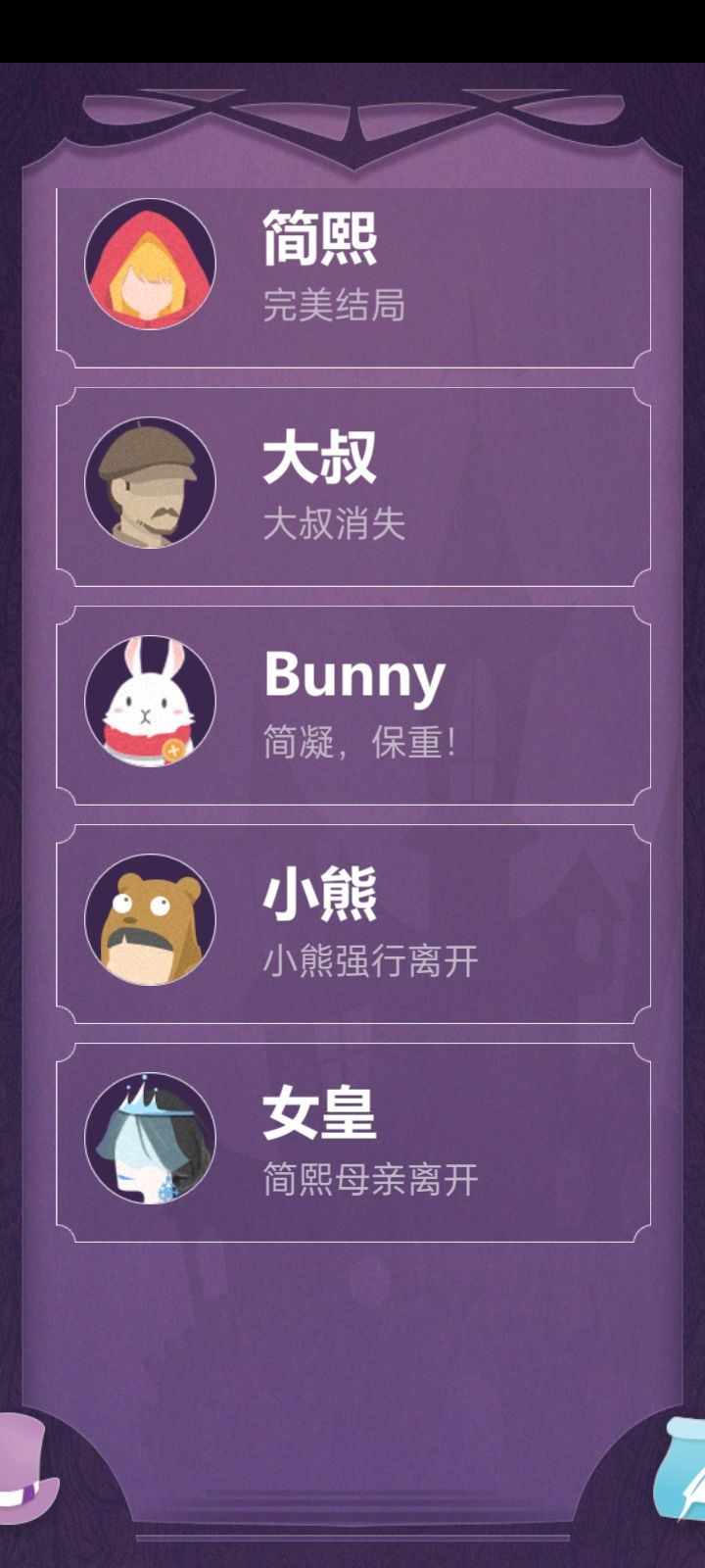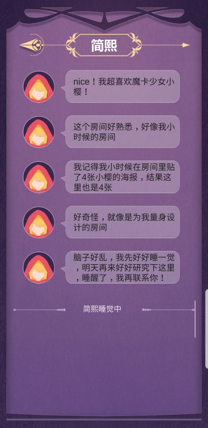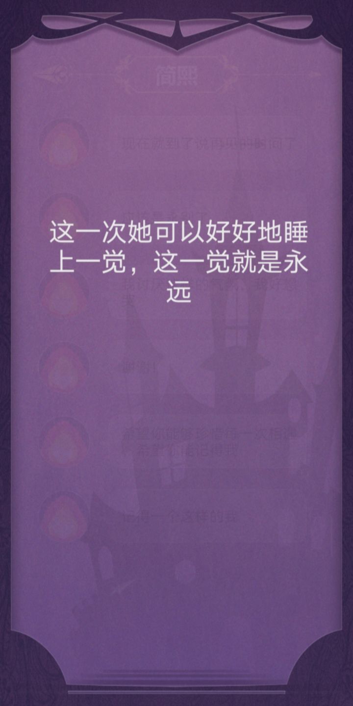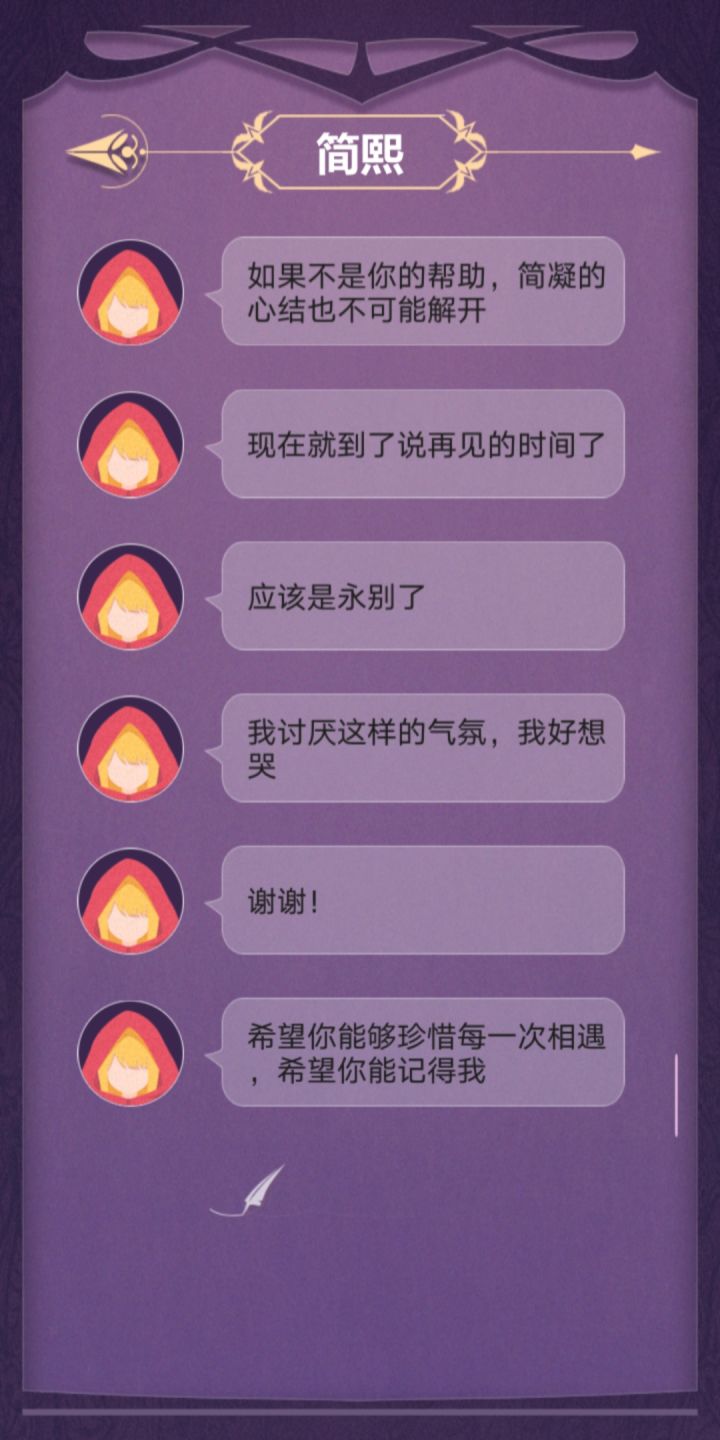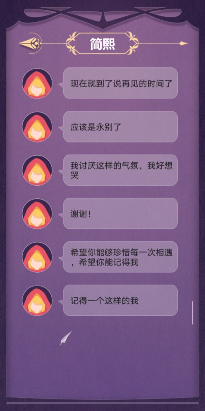 完美撒花!这个故事真的超感人!可以说是很真实、很悲伤的一个故事吧。故事需要玩家根据各个人物交流中给出的线索去进行步步推理,进而概括总结。右边的小消息框我愿称之为“人物内心独白”真的很能体现人物内心的想法。通过这个可以反向判断出人物语言的真假小tip:不要轻信任何人说的话!因为他们的立场都是片面的、不完全的,他们都是从自身出发的。这就需要玩家去设身处地得想一想了但是还是有些地方需要改进:1.简凝,简熙的人物逻辑关系在不同人物的表 述中可能有些混乱。(就有的时候我可能真的分不清哪个是姐姐,哪个是妹妹。)2.错别字。希望能好好校对一下3.关于每一条消息只能显示3行这件事。(虽然说不影响游戏进程)4.希望能添加结局墙来帮助玩家回溯剧情,亦或是从中得到启发成功get“完美结局”5.希望能添加一个大概的等待时间的提示,来给玩家一个更好的消息交互体验。这样的话也不至于出现 "简熙一睡睡两天" “大叔探路几小时”......这样的情况