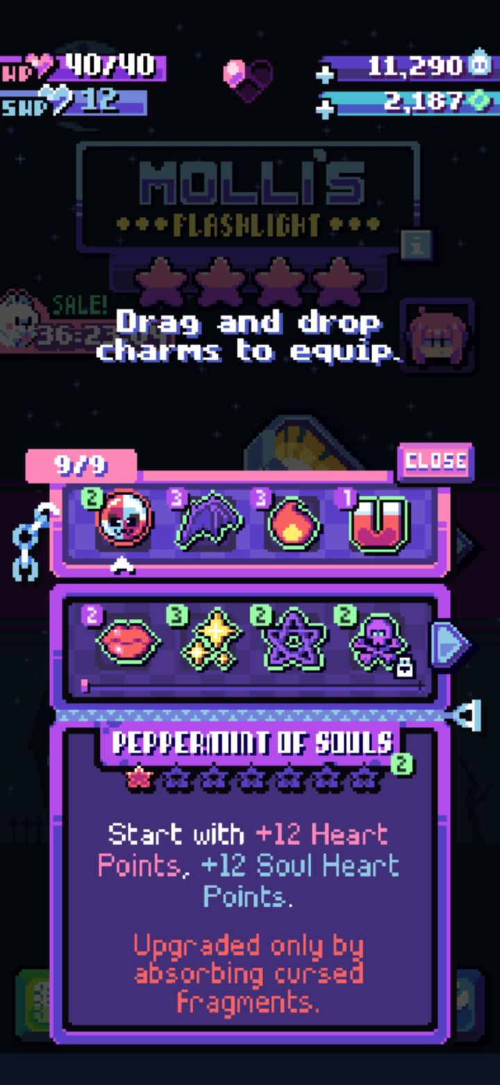 手电用的满星镰刀,从简单开始打,接关困难简单难度获得的糖果增益和诅咒可以保持,简单关尾用了一次巧克力(Halo Bar)的复活,困难难度血量续航主要靠黄色糖果的免伤,僵尸诅咒(Living Dead Curse)可以稳定提供蓝心,然后就是靠毒火减免和延长无敌时间的装备糖果