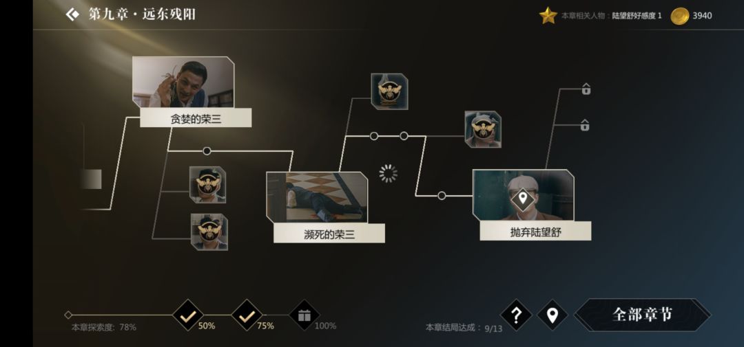 濒死的荣三后续剧情,需陆望舒好感度>0,≤0触发潜伏失败剧情。 陆望舒好感度可在第七章大风起兮内获得。