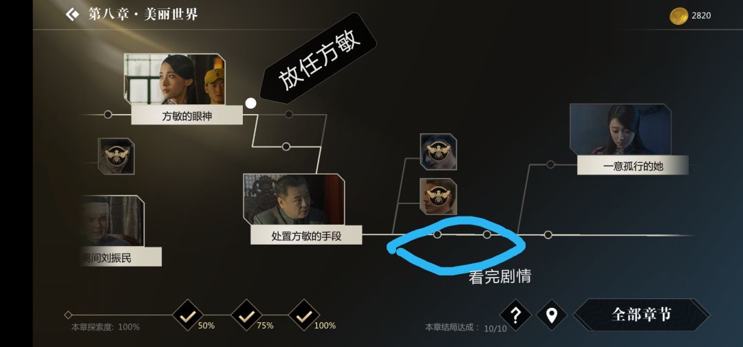 [表情_捂脸哭]全结局都解锁了,“美丽世界”却还卡在95%探索度,而且也没有任何锁定提示。不少收集控玩家都遇到过吧…… 后来看了贴吧攻略帖,原来“方敏的眼神”剧情就是丧钟结局和美丽结局的分支了,而且在那里选择“放任方敏”后,还要继续选择嫁祸方敏的方式,并看完剧情,才能把各个节点连接起来,达成100%。 看来大家都一样,刚开始舍不得方敏,想先劝说她,然后再回来点击另一个选项来刷探索度,谁知这里是要完