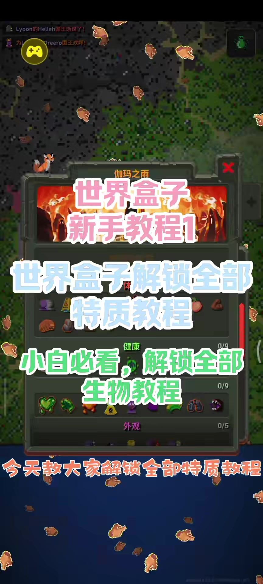 世界盒子解锁全部特质限制攻略↓ 1.首先开一个新世界 2.然后拿导弹炸一下炸出1000枚炸弹的成就 (该成就可以获得死亡炸弹的特质) 3.然后再拿核弹炸 炸出隐藏地形酸地 4.再用手指复制酸地后铺满整个世界 (可以获得 让我们别 成就) 5.然后在世界上放上四个种族 (可以获得中土世界成就) 6.放出一个恶魔往恶魔身上撒 孢子 僵尸感染术 瘟疫 愤怒 然后再让他沙11个生物获得老将特质 (可以解锁