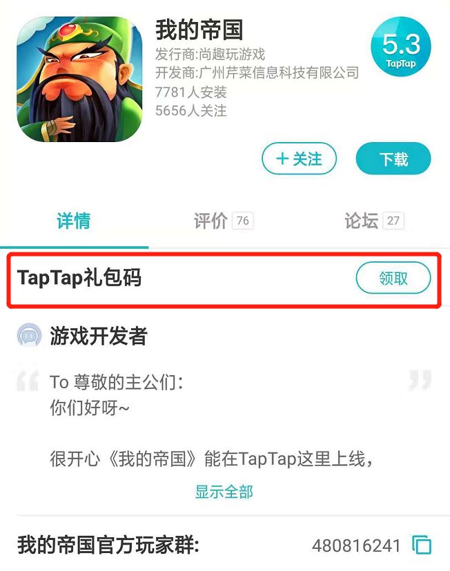 尊敬的主公们~我们今天为TAPTAP平台上线了专属礼包码~主公们可以领取并在游戏内兑换为道具哦!具体的礼包内容为:黄色武将箱*2、黄色装备箱*2、招募令*5、寻宝令*5、铜币*30万!!具体领取方式,看这里!1.进入TAPTAP“我的帝国”界面,在详情页这里找到“TAPTAP礼包码”,点击领取~2.点击领取后出现专属礼包码,点击右边的小方框可以复制礼包码~3.进入游戏,点击界面内右下