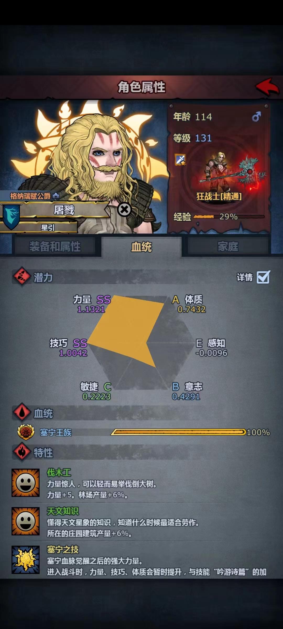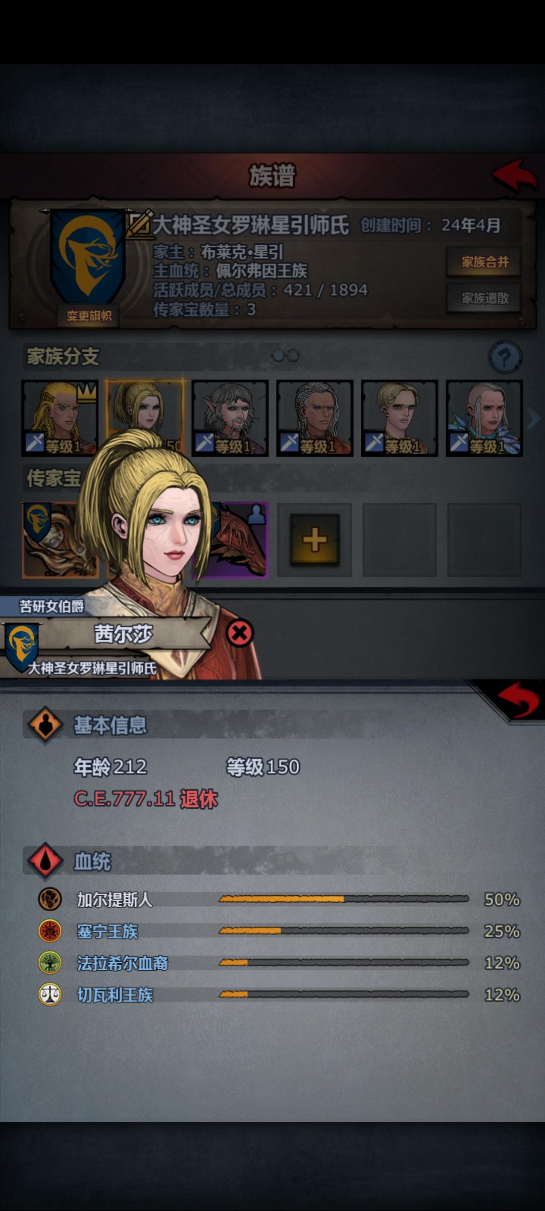 今天准备冲法拉尊敬,琢磨先嫖几个公爵,明天尊敬就能愉快的繁殖公爵了。 前十年无脑上各种特性工具人(富有魅力+有异性缘+气质),顶级祈祷,春林相亲都上。只成了一个。 无意间发现成的那个是纯血精灵,无特性。 后十年只上80血以上的,我有五种提纯好的,法拉,佩尔,精灵,希尔,宏朝… 十年成了8对,前几年还祈祷,后面没材料就没祈祷,平均每个人遇到两三次公爵就能成。 不知道是巧合还是血脉纯度高有潜在加成,有