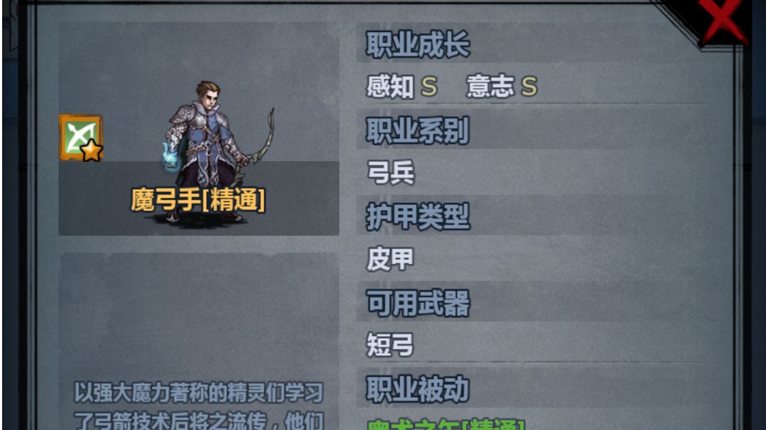 1.苗子选择 精灵s感a意起步。 上古(+150岁)自然(+60岁)专注(+90岁)起码要有一个,因为是复合职业,部分技能需要传授,寿命短了对不起成本。 2.成长与精通: 一级三转大德鲁伊吃68级大德,后面转魔弓手传授本家技能。 精通:敌人意志低与自身一半精通意志好,否则精通感知。 魔弓手二槽放逐之刃是灵魂哦(短弓都能学,需要感知套) 魔弓手吃法术命中和物理攻击力哦,别看我带了个法术攻击力没用哦。