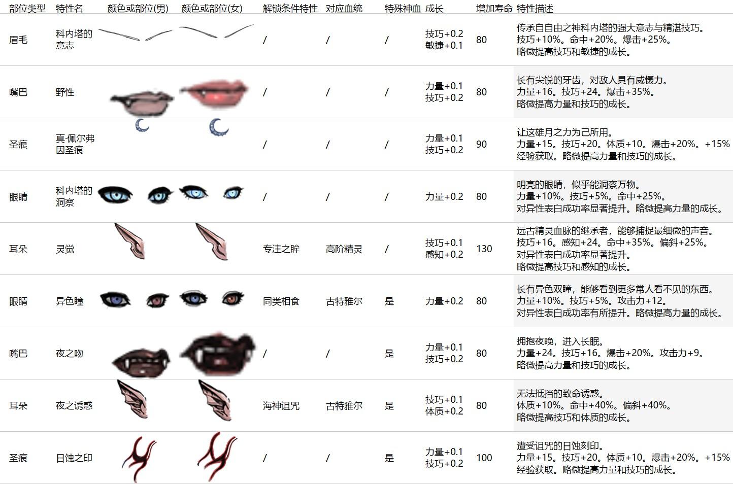 ·1背叛烙印:力量+7,感知+9,表白提升,怀孕率下降,寿命+65 面部特征:红色眼睛 ·2死亡讯息:力量+5%,感知+10%,表白提升,怀孕率下降,寿命+25 面部特征:尖复耳 ·3自然密码:偏斜+30%,远程偏斜+30%,表白提升,怀孕率下降,寿命+30 面部特征:紫色唇色 ———————————————————— 下图眼睛为背叛烙印,唇色为自然密码,耳朵为死亡讯息 ·4潜伏的杀手:敏捷+5,