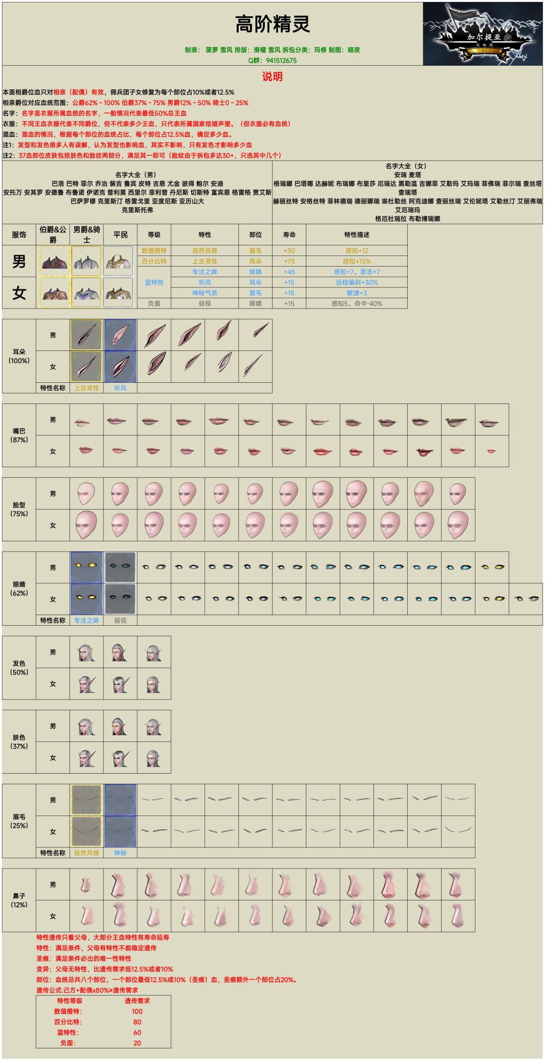 经过2个月的游戏,不停的配种,我终于把黑暗精灵面相给看懂了。 黑精灵的5大特性:死亡讯息、背叛烙印、自然密码、潜伏的杀手、狩猎本能。其中死亡、背叛和自然特别好识别,一看就学会了。 这个尖耳朵带有分叉的(尖复耳)是死亡讯息,这个充血的红色眼睛是背叛烙印,这个涂满紫色口红的是自然密码。很好认且男女无差别。 下面我重点说一下狩猎和杀手。先从男性的狩猎本能来讲。狩猎本能特征表现在鼻子上,鼻子尖且翘,像一个