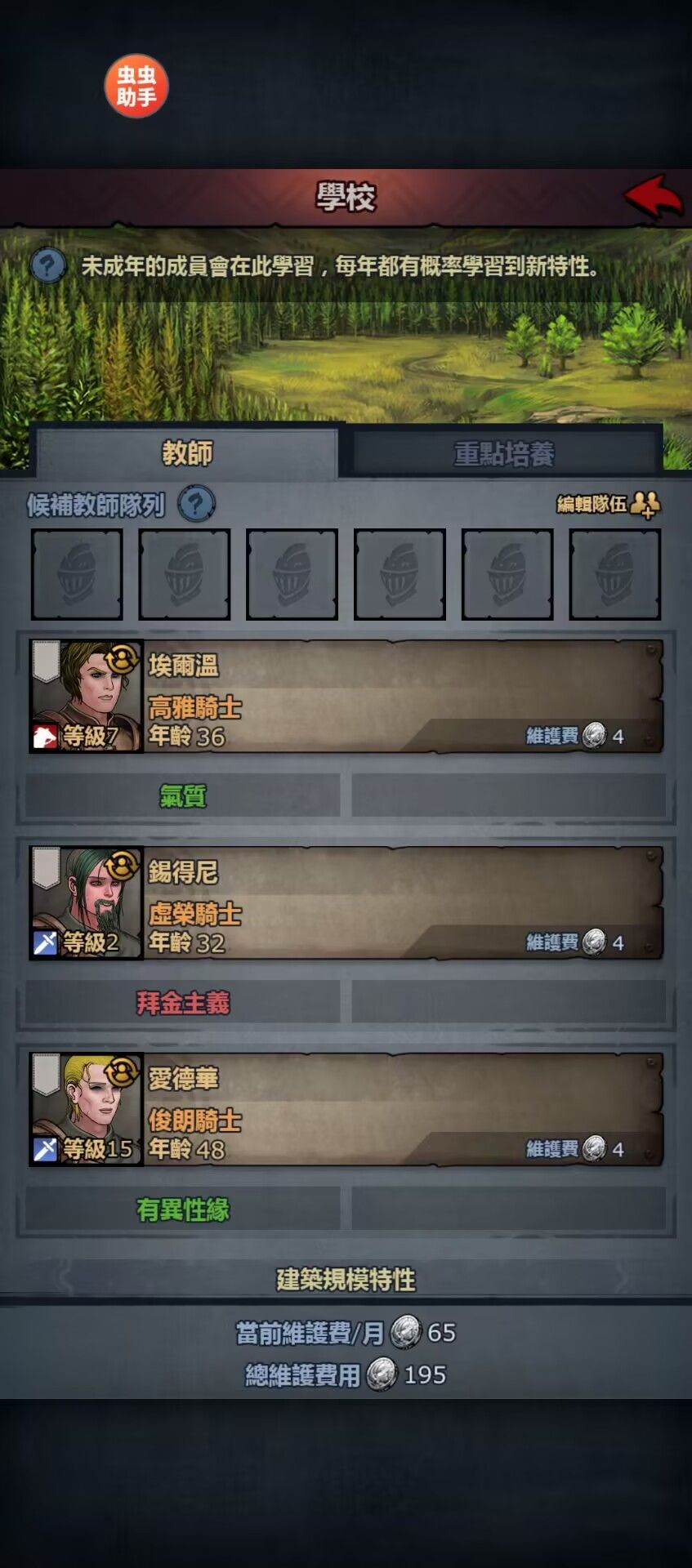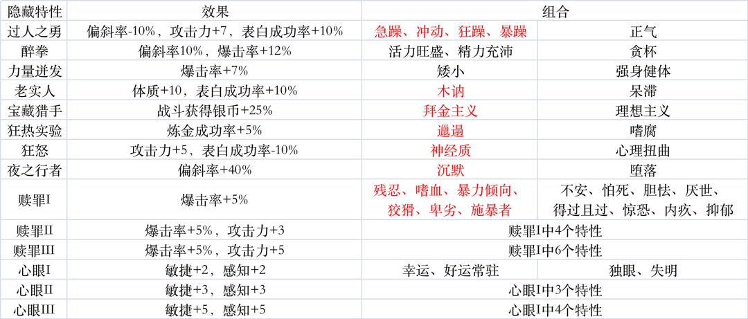 根据下表最容易获取的特性为赎罪系列。条件为苗子需要有残忍、嗜血、暴力倾向、狡猾、卑劣、施暴者。其中施暴者、暴力倾向和嗜血是没有负面效果的。所以可以在教师中选择有这些特性的老师。 刷伤只在有感染风寒这一轻伤出现时刷,不然其他的都不太容易出现精神创伤。三个赎罪加施暴者和嗜血共计25暴击率和10攻击。 仔细研究隐藏特性的产生规则后提出的一种刷隐藏特性的方法。首先所有特性的获取难度都差不多,且普遍偏难,比