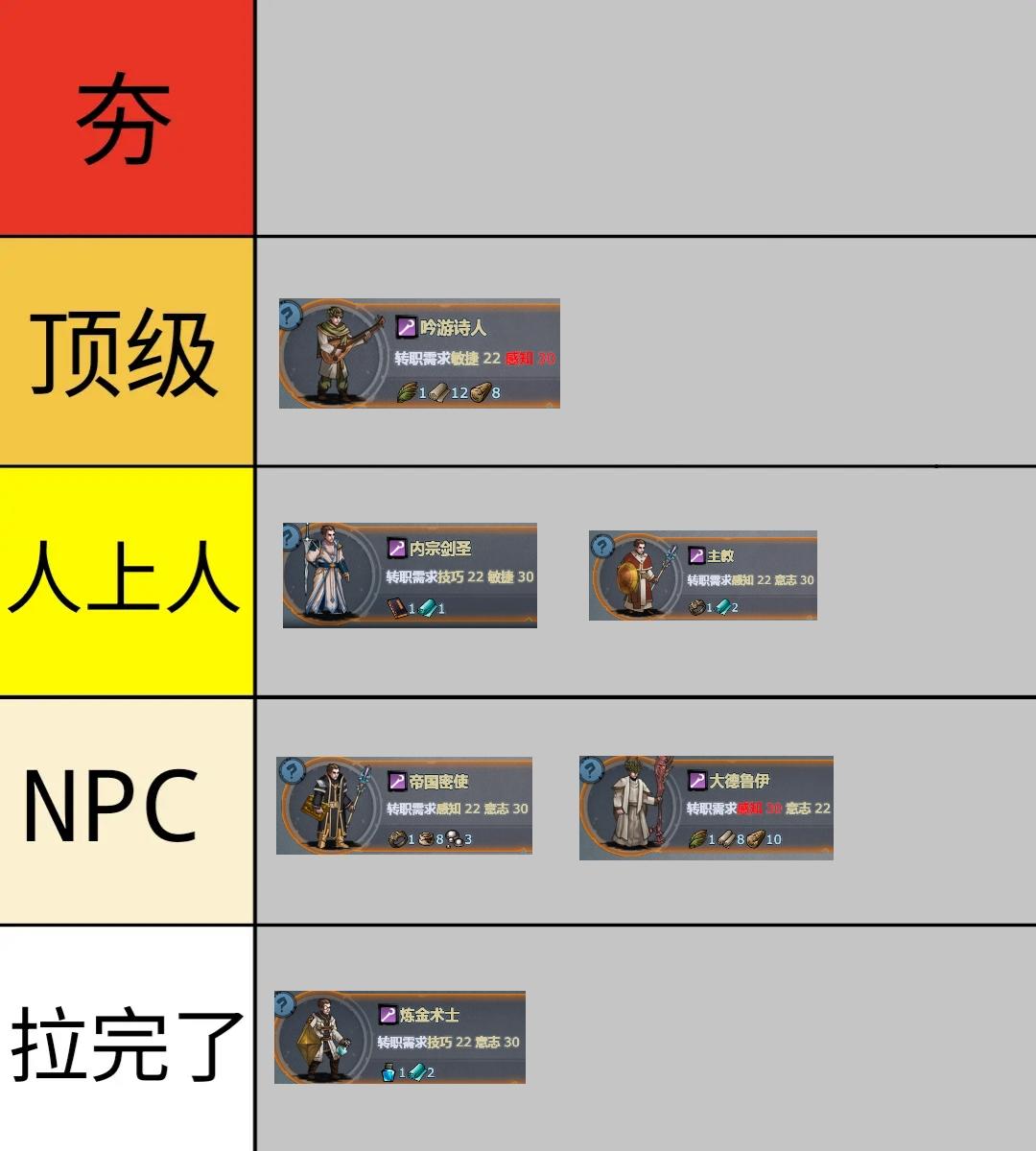 提个问:怎么小技能没有蛮力加物理攻击力啊 ,论坛里提前预测的技能图是有蛮力的,实际版本没有是为了职业平衡吧。 技能实况图 单看职业成长的话,应该比大德鲁伊少一点感知成长,多一点意志成长,好像也没有力量成长。所以玩魔弓手成长吃自身职业,有资源就密使,后面看有没有大佬攻略。 职业萌新推荐度:⭐ 亲身试毒了[表情_微笑],魔弓手培养等同于后期四转职业。 职业上限以及对比 魔弓手上限高于雷主的,算上神器,