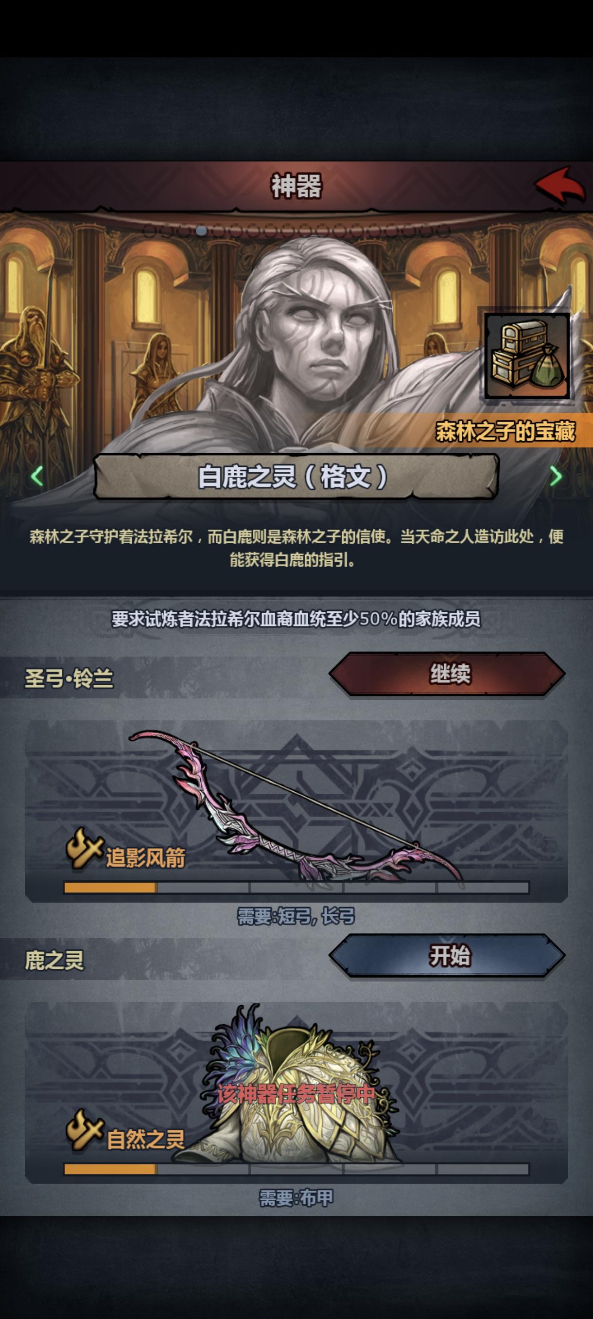 ㈠神器任务及奖励 ㈡神器任务(详细) ⅰ无名之刃 第一阶段:森之祈愿友善,六级铁匠铺,缴纳2400生铁,通关剧情王朝密宝 第二阶段:缴纳160马、160精钢、30小彩石,通关剧情暗灵之岛 第三阶段:缴纳10破剑者、7破风刀、1350猪、通关剧情禁忌之所 第四阶段:森之祈愿信赖,缴纳60天河飞鱼、50战马,通关剧情背叛之人 ⅱ黑夜 第一阶段:森之祈愿友善,六级市场,缴纳20小彩石,通关剧情神秘占卜 第