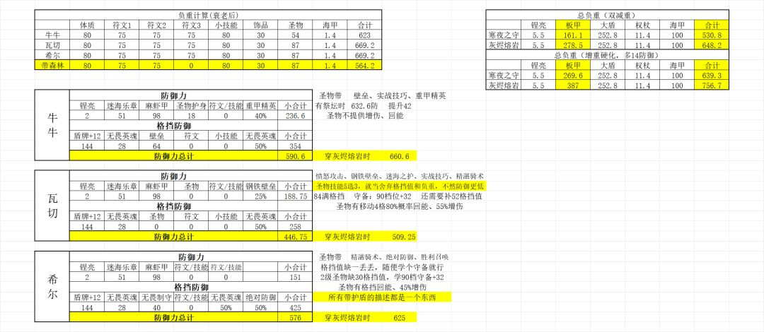 即将出奈莎神子,本帖讨论作废,神器注入灰烬熔岩,双减重或者增重硬化都可以 一、负重,重量概览 ~苗子衰老前的负重不讨论,衰老后要带全套装备的最低要求是530.8负重,灰烬多118负重同样也多50防御,性价比很高 二、各个圣物防御属性及技能选择 1、牛牛圣物 ~圣物带:壁垒、实战技巧、重甲精英。 ~优点:造价相对低一些,防御很高,生存端拉满 ~缺点:无增伤、回能手段,穿灰烬时需要提升负重,符文/体质