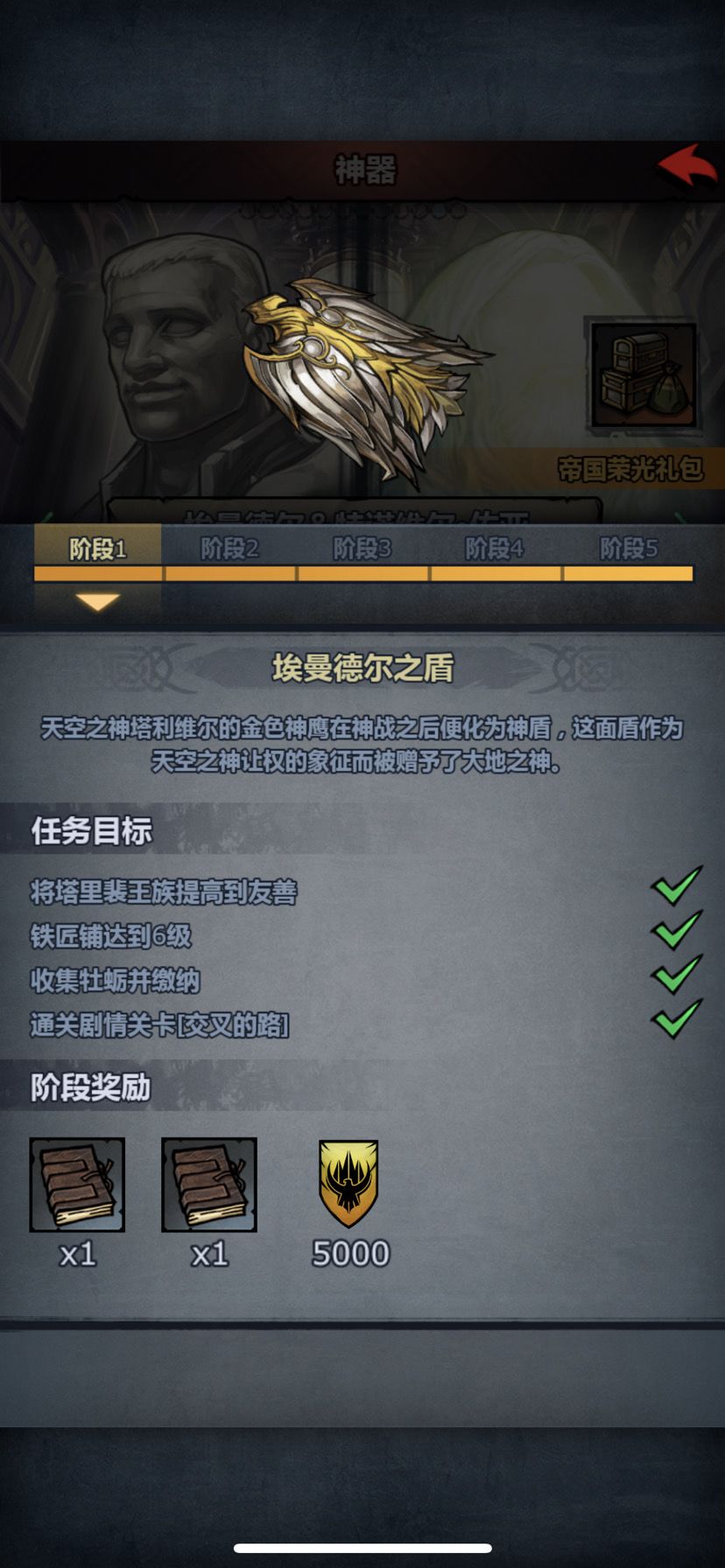 一阶段,需要缴纳牡蛎,具体数值忘记了 20个丰收蛋。瑞格群岛任务掉落。缴纳资源的具体数值忘记了。 第二阶段的剧情会给你两个选项。选择帮助温道尔,神器分支就是小盾,选择帮助帝国,神器分支就是锤子 我选择的是帮温道尔,下面是小盾神器的第三第四阶段。 缴纳威弗提亚小盾20个,龙齿锤5个。 缴纳红宝石20个。神鹰手镯60个(瑞格群岛任务掉落) 做完这些能获得小盾成品装备,需要自行注入神力。来解锁神器效果 然