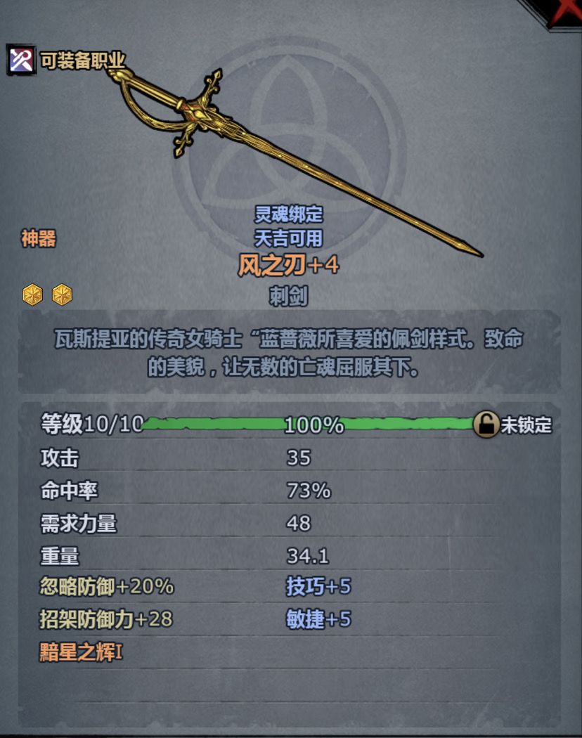 刺剑选用的是银色蔷薇(因为这把攻击高,还带无视防御伤害)详见附图 神器效果:(由于神器负面属性可能经常减血,最好带神器皮夹吸血) 用了一段时间发现防御还是过剩了,洗双孔加攻击就可以了 决斗士被动: 刷图技能带借力返还:(根据敌人攻击力反击,遇强则强,遇弱则弱),我试过带大剑的招架反击发现反击伤害更低了,因为刺剑本身伤害就不高。(实测借力返还学到3就够用了,学到5铁甲还是不能一下反死,所以没用) 借