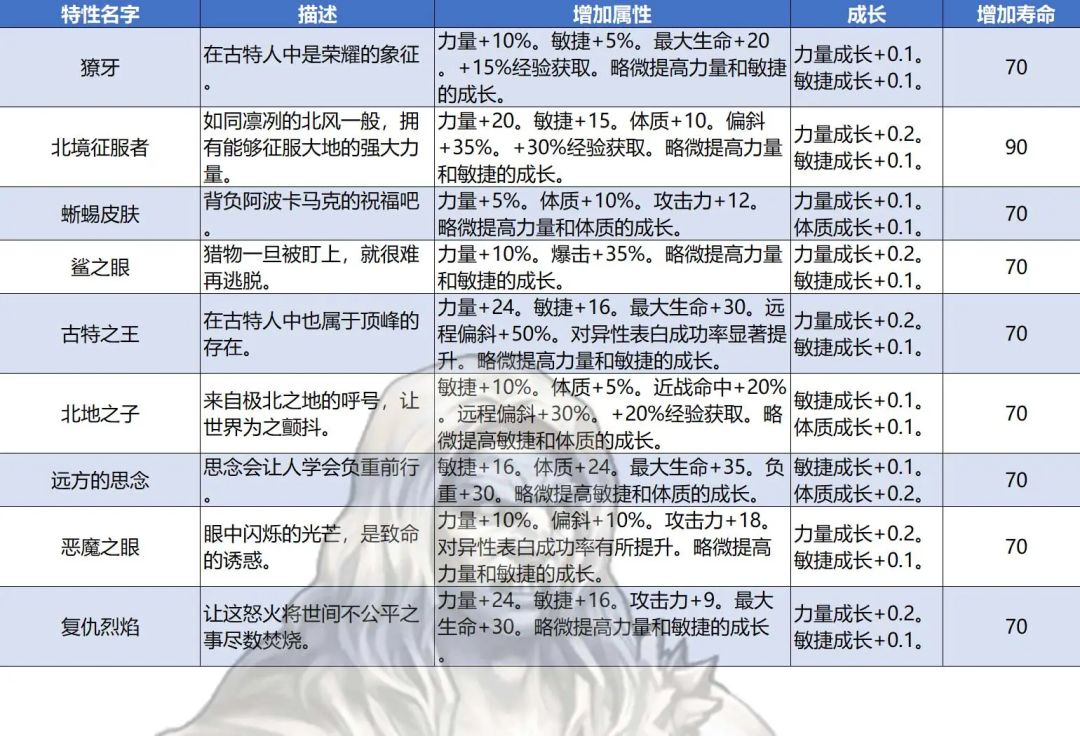 基础寿命+神血寿命+神特寿命+普通特性寿命×2+拜神。 1.基础寿命 基础寿命为固定值,50-70年之间。 2.神血寿命 30+血脉占比×20. 例70法拉神血:30+70×2=170年 3.神特寿命 查表。 各个神血特性汇总和血统需求(0930 更新瓦提肯神血特性) https://www.taptap.cn/moment/502640958421075766?share_id=e1dfc7b8