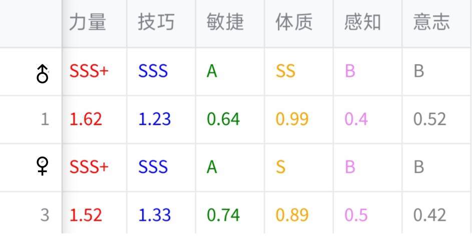 如题,假设90%塞宁混10%古特。神特褪色、苍白,极限六维成长如下 那么假设为女性顶级赛神,成长为 力量 1.5 1.5×90×1.25=168.75 技巧 1.3 1.3×90×1.1=128.7 敏捷 0.7 0.7×90×1.05=66.15 体质 0.85 0.85×90=76.5 ----------------------------------------------------- 几
