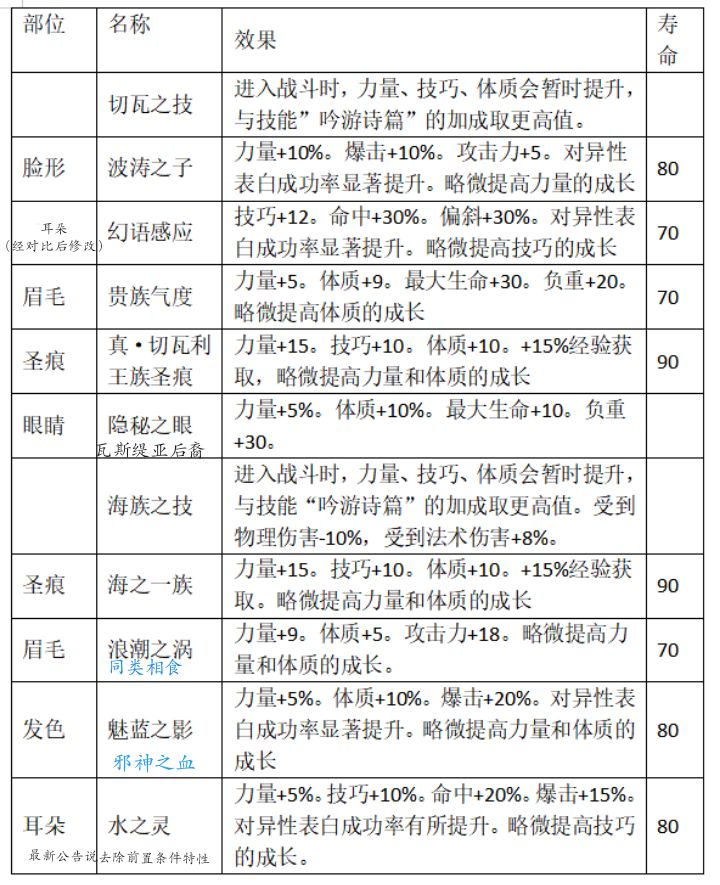 瓦斯提亚血裔(鼻子) 威严(嘴) 山川之子(脸型) 索弗利夫的自信(嘴) 太阳之眼(眼睛) 台地之王(肤色) 非凡力量(脸型) 危险嗅觉(鼻子) 真圣痕 素材来自论坛
