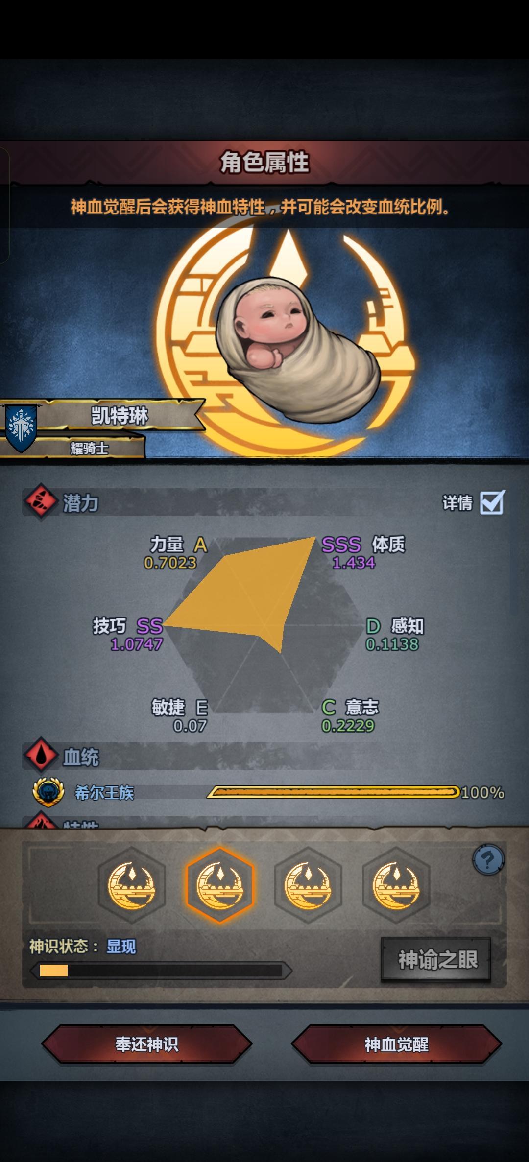 老大们,我事萌新,目前我打算先把法拉拉到信赖,然后再尊一个,现在已经漂到了伯爵(孩子纯血加尔提兰还没成年)。血脉提纯方面,有希50、宏62、切50、佩75、精灵50(敏感双A 专注之眸)、法拉50、牛头50(都还没有成年),城堡11级,能升级的建筑都升满了,有一转三盾勇小公主(62岁104级),接下来该怎么玩啊?#诸神皇冠 #诸神皇冠萌新