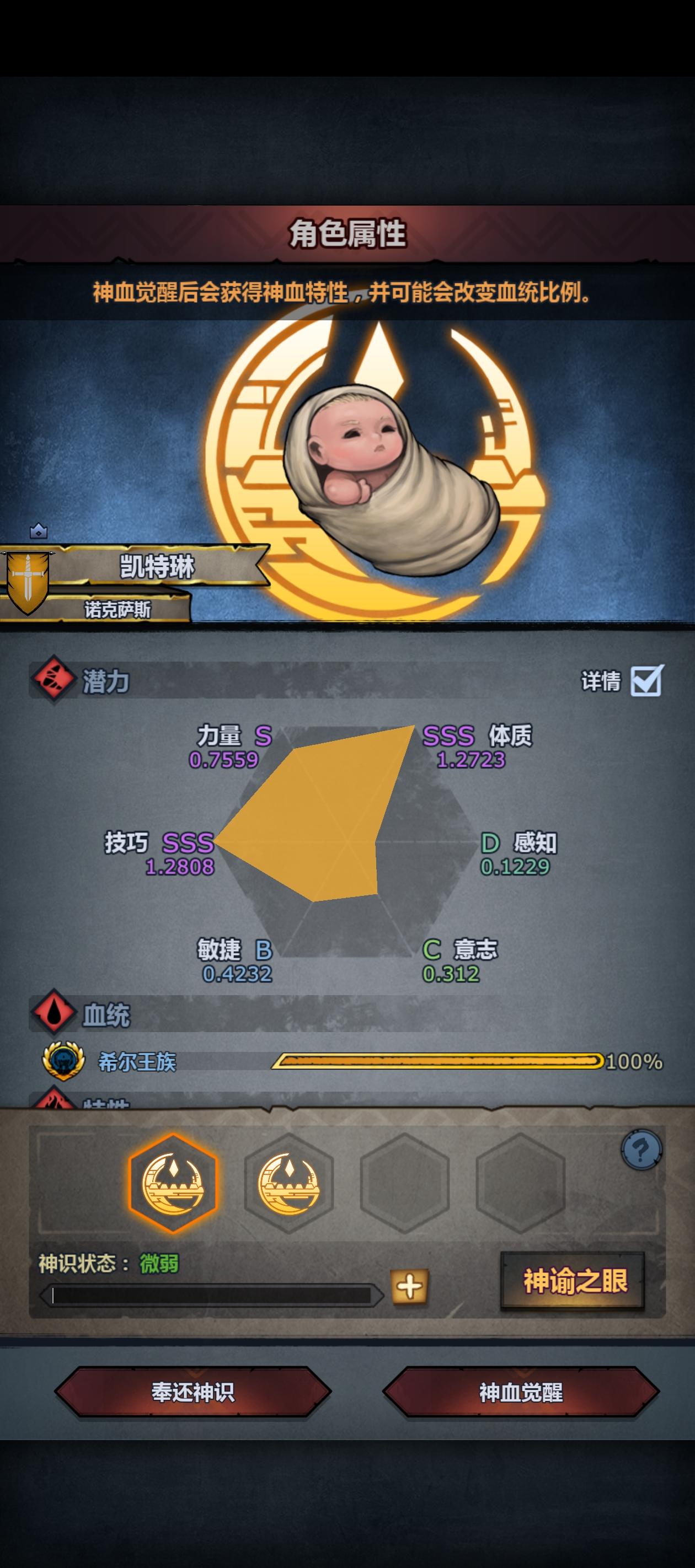 本来想混个太同佩神玩内宗的 混了几队没混出来 还要弄塞宁切瓦混血神子 不想三重坐牢 看到这个纯血苗子还不错直接妥了敏太低了没弄晨光已经做好随时暴毙准备了