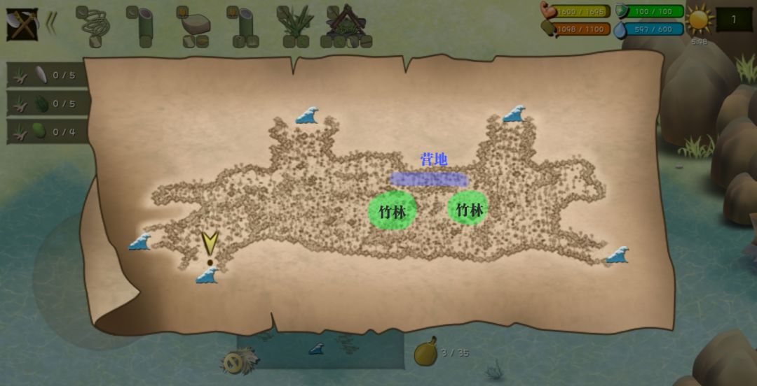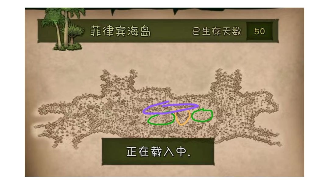 背景:手残,已经彻底放弃打猎了,无兽袭。 其它图: 地图: 绿色是两片竹林,竹林上方的紫色区域可以建第一个营地,竹林中间的黄色区域(几丛石头中间)可以放大套索陷阱捕野猪和捕鳄鱼陷阱。 开局:海岛地图是没有淡水的,但椰子非常丰富,一个椰子可补充100淡水,完全够用。尽快做竹竿套索摘椰子,淡水过滤器不急着做。 如果把营地建在两片竹林上方,可以考虑建石屋,竹林上方的干燥走廊地带大石头比较多。 工具:斧头