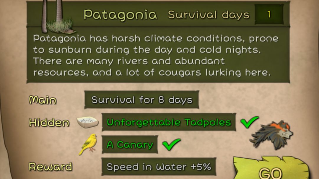 发现TapTap上似乎没人做隐藏任务攻略,所以就有了这篇攻略(水的最快乐的一期) 不得不说,巴塔哥尼亚的隐藏任务相比其他图是真的简单而且好做快速,其他图的隐藏任务都没法这么快吧() ---------------------一条礼貌的分界线---------------- 直接步入正题 一、救金丝雀 需要准备:石刀,1野草莓 金丝雀具体点位如下 靠近时,地图上会显示方位,方便寻找 走过去发现金丝雀
