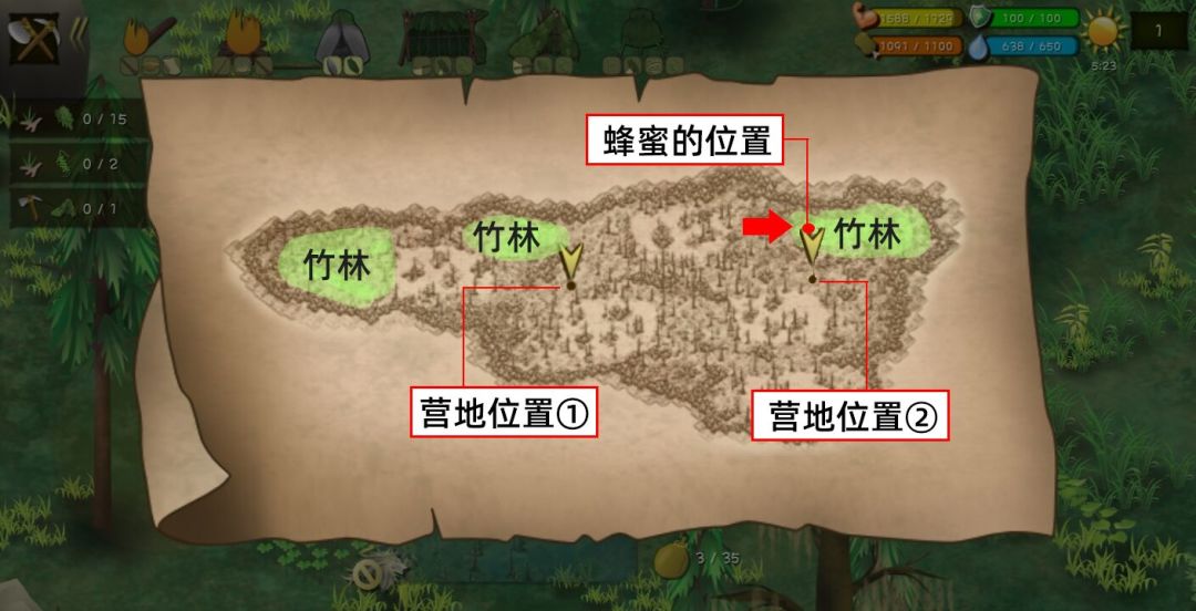 前期营地可以建在地图左边的竹林或者是采集蜂蜜的附近 开局制作工具的先后顺序:①斧头、②竹竿套索、③木锄、④石刀、⑤竹叉、⑥弓、⑦箭、⑧除虫剂、⑨骨针、⑩炮竹 (PS:1-7个先做,8-10可以选择做) 在下拙见: ①大家要在沼泽做完斧头做套索,因为沼泽的藤条好多在树上而且还是2根,跟之前的图有些不一样,做了套索就可以获得很多藤条。 ②这个图大家也要记得随手保存,因为大家又遇到了鳄鱼,而且鳄鱼在水