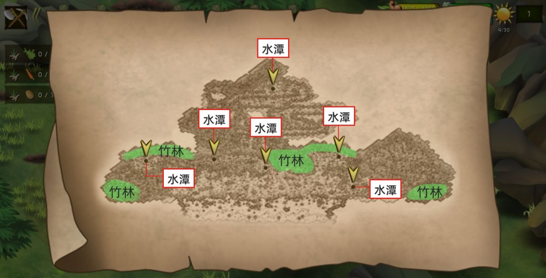 背景:纯新手,不会打猎,全程没打到过任何一个猎物。 其它图: 附地图: 绿色是竹林,蓝色是湖,黄色是放大陷阱抓野兔和鹿(我没抓到过鹿,有人抓到过)的重点区域。稍稍入手之后建议买个地图,地图限时五分钟。 1.工具顺序:斧头(砍竹子等)、锄头(挖地瓜)、竹竿套索(摘鸟蛋)、石刀、其它根据个人需求。 2.营地:第一个营地选在右上的湖上方,晚上喝水or从水里取渔网都方便,背靠竹林,竹林是资源最丰富的地方,