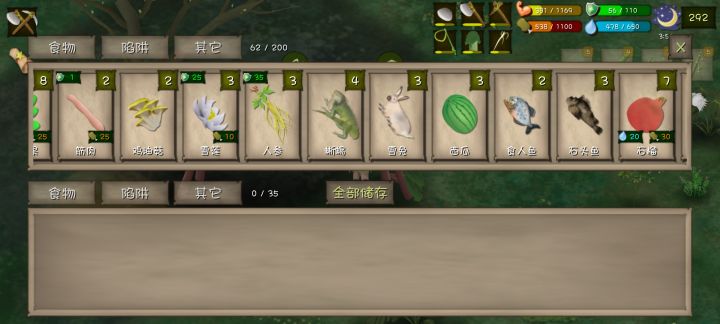 #挨饿荒野 新图玩了,前期找不到小豹子刷新点在哪浪费很多材料找不到肉吃导致差点缺营养死掉。没玩之前很期待亚马逊河里有大森蚺和大鲶鱼,造型奇特的奇花异果,但是并没有有点小失望。种了几个小果树也差不多可以成熟了,这地图还是蛮多小果子的,就是种子掉率有点低。那个重压陷阱烂了两个都抓不到,可以推荐一个位置嘛。最后就是你们都去玩新地图了没?