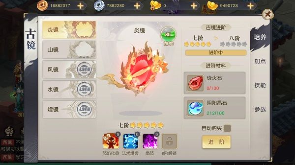 在《火王》手游的剧情中,古镜是能够降灾解难的上古神物,不仅能为大唐带来安康和平,还是拯救神域的关键秘宝。同时古镜也是所有玩家梦寐以求的法宝,它的能量潜力无穷,正确使用它甚至可以在游戏中叱咤风云。那么如何将这一秘宝发挥出它最大的能量呢?小编来告诉你。首先,点开系统界面的古镜系统,我们能看到有炎镜、风镜、水镜、煌镜、山镜这五面古镜,它们分别蕴含着五种元素的能量,所有玩家都可以得到它们,但是想要将这些