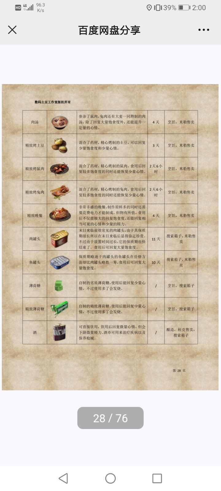 总结: 食物:三级大棚前吃烤制食物和黑/白面包,三级大棚后每天3烤土豆+1烤鼠肉,食物紧缺或有淋浴器/音响,可以吃腐坏食物。 交易(按南城永生考虑):每天在博士那买完木、布、草药,做成绷带/夹板、腹泻药。食物充足可以在住户那买兔肉和鼠肉做成肉汤卖。 食物推荐:食物以饱食度性价比为先,即同样的食材,能提供更高的饱食度。从饱食度研究表(贴吧大佬LRJ1985_制作)看出烤兔肉、烤鼠肉、烤土豆和黑/白面