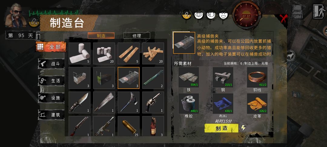 这次游玩还是比较顺利的,前期医院两本书,中期警局工厂有针有红牛,贵重品出的特别多,很早就开始扫荡商人了,这次侧重火药少换了40个钢,没想到钢存量也能上200。最后一波商人之后基础资源如图。不过狗子还只有5级接近6级😂