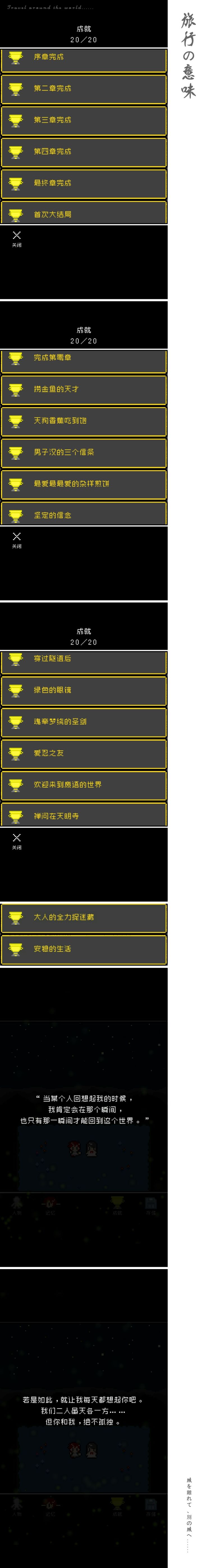 好久没玩像素风的剧情手游了 这次依旧是催泪系列 玩过很多类似的游戏了 大致的结局也能猜到 这个游戏的两个结局对我来说 悲剧结局会更触动我 如果就到那里结束也很好 只是游戏会给予我们圆满 可现实是很多人失去便失去了 人生没有重来也总充满了悲伤和遗憾 希望我们都能来得及对所爱之人说出想说的话❤️-你知道吗?天狗待宵花的花语。-七海,告诉我吧。-那我说了,你要听好哦。天狗待宵花的花语是……“祝