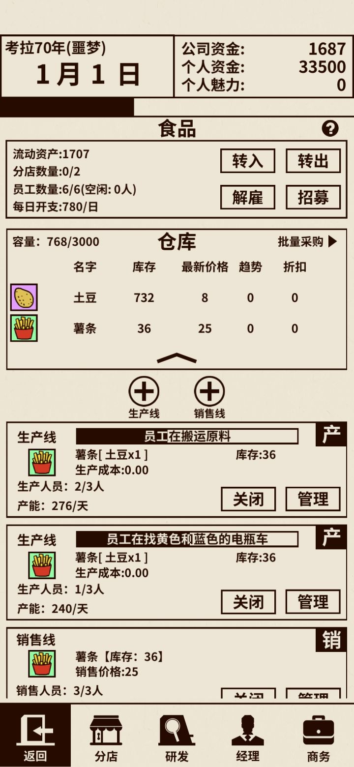 首先时间流速太慢了,别跟我说沙漏,已经开了,还是太慢了,沙漏的速度是不是减速了。其次分店现在是真的坑,除了两人的,剩下的都是垃圾,维护费太高了。然后生产线太少了,而且超级坑,两条生产线各放一个人,比一条生产线上先放满八个,生产数量更多,真不知道正式版你们怎么想的,一个生产线的保底生产数量,和分店维护费,直接把分店和多员工给干废了,真·无语。(类似这样的坑,还有好几个,就不一一说了)接下来来个