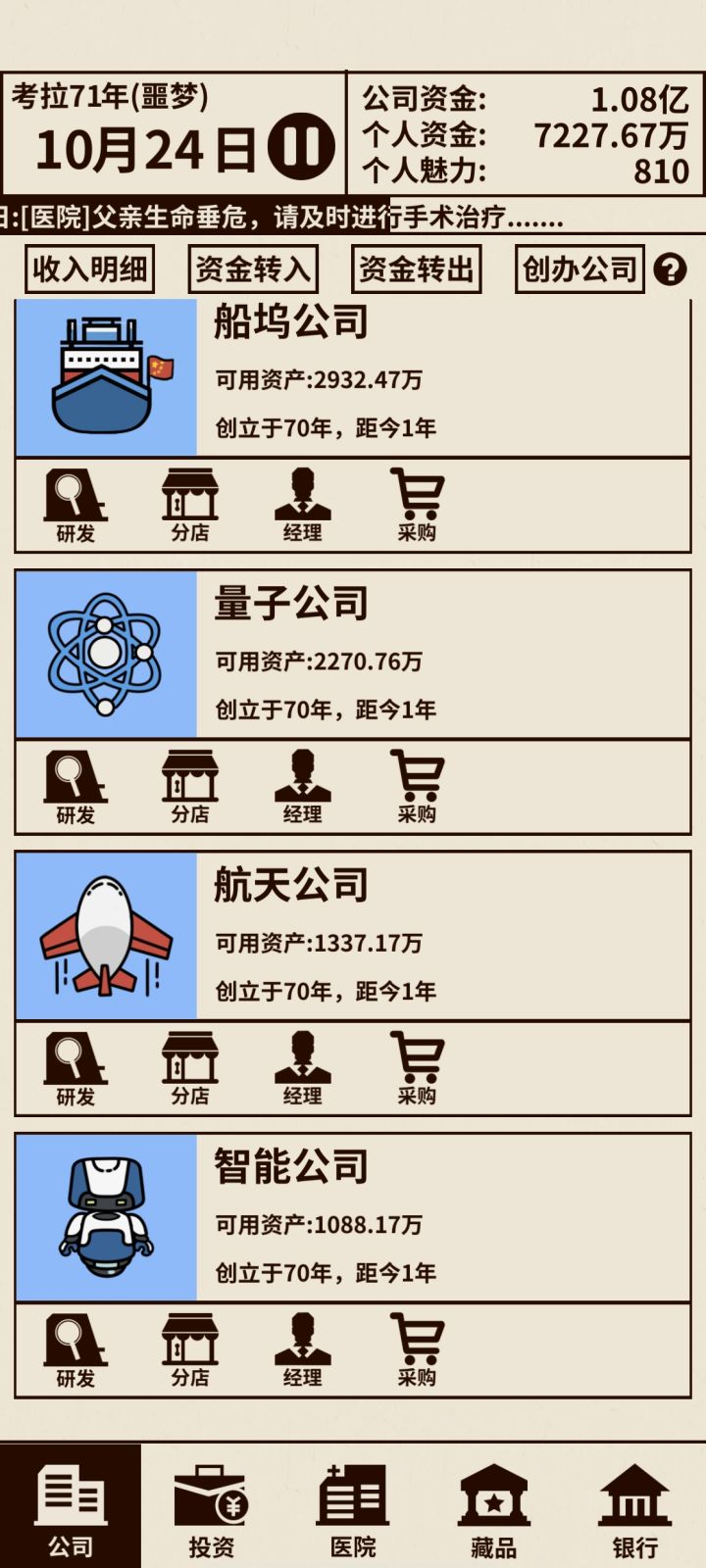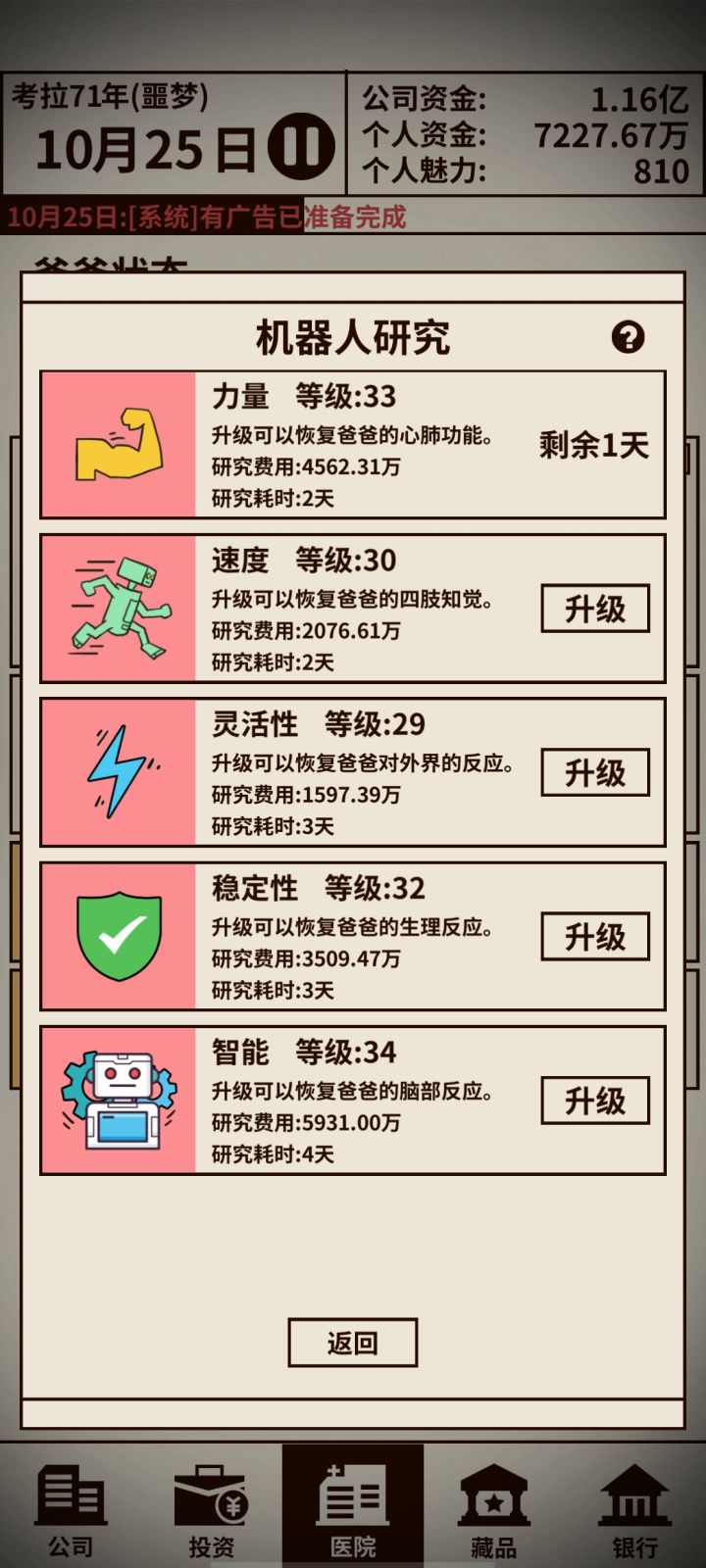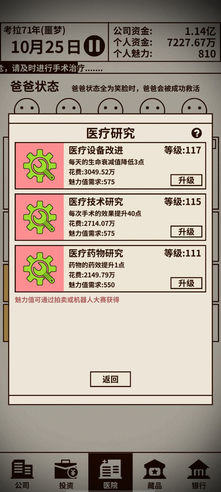 一、开局操作:1、赚钱2、升级机器人→参加机器人比赛→聘用经理①每次参赛前三名就有5-10点魅力值,基本上2-3局就有15点魅力值②魅力值15点,便可聘请经理,解放双手,只需点击研发来升级机器③开局不停升级机器人,都会获得前三名3、升级医疗研究4、拍卖会:魅力值↑5、不必急着开分店和开其他公司,收支盈余多才进行下一步二、功能介绍:1、医疗研究+机器人研究①医疗设备=续命,升级
