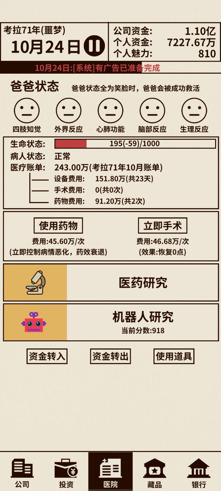 一、开局操作:1、赚钱2、升级机器人→参加机器人比赛→聘用经理①每次参赛前三名就有5-10点魅力值,基本上2-3局就有15点魅力值②魅力值15点,便可聘请经理,解放双手,只需点击研发来升级机器③开局不停升级机器人,都会获得前三名3、升级医疗研究4、拍卖会:魅力值↑5、不必急着开分店和开其他公司,收支盈余多才进行下一步二、功能介绍:1、医疗研究+机器人研究①医疗设备=续命,升级