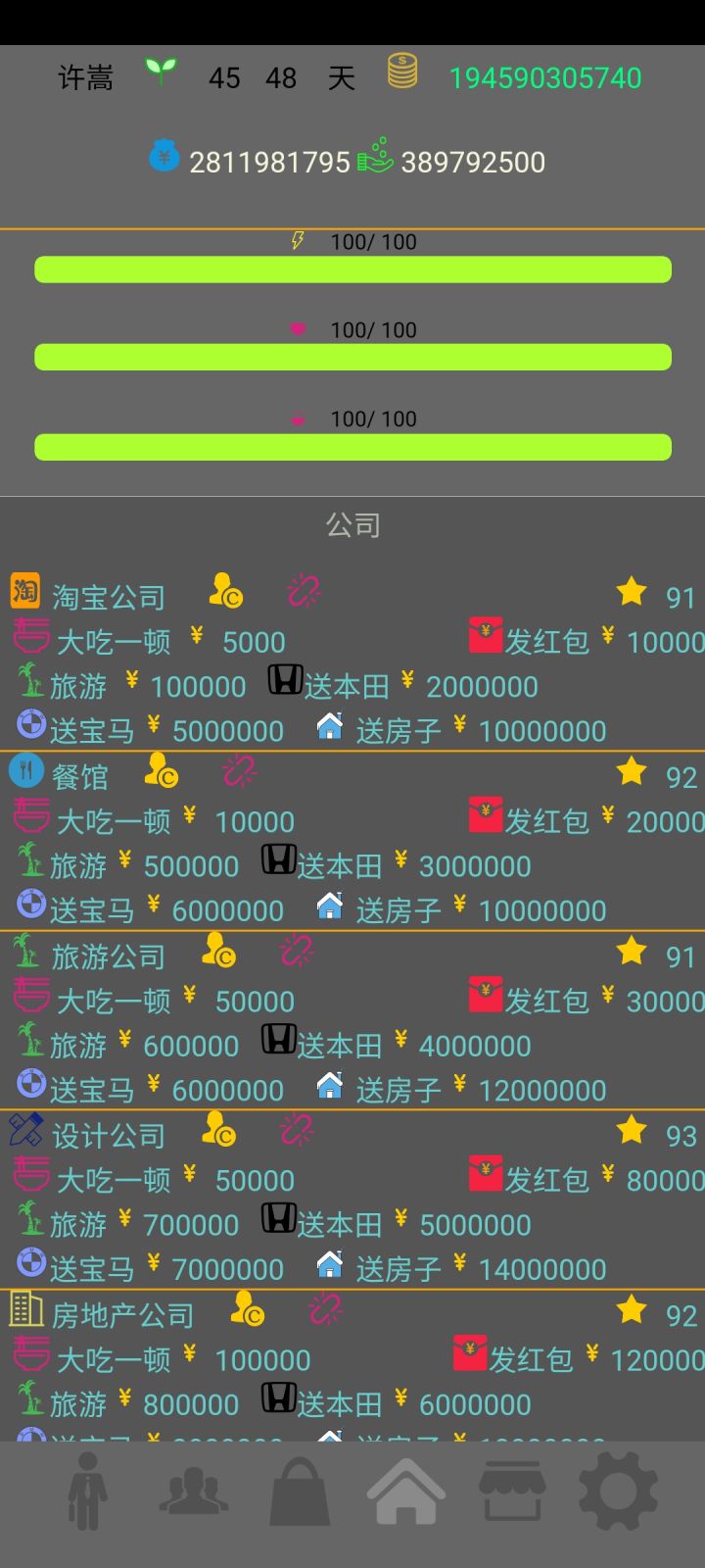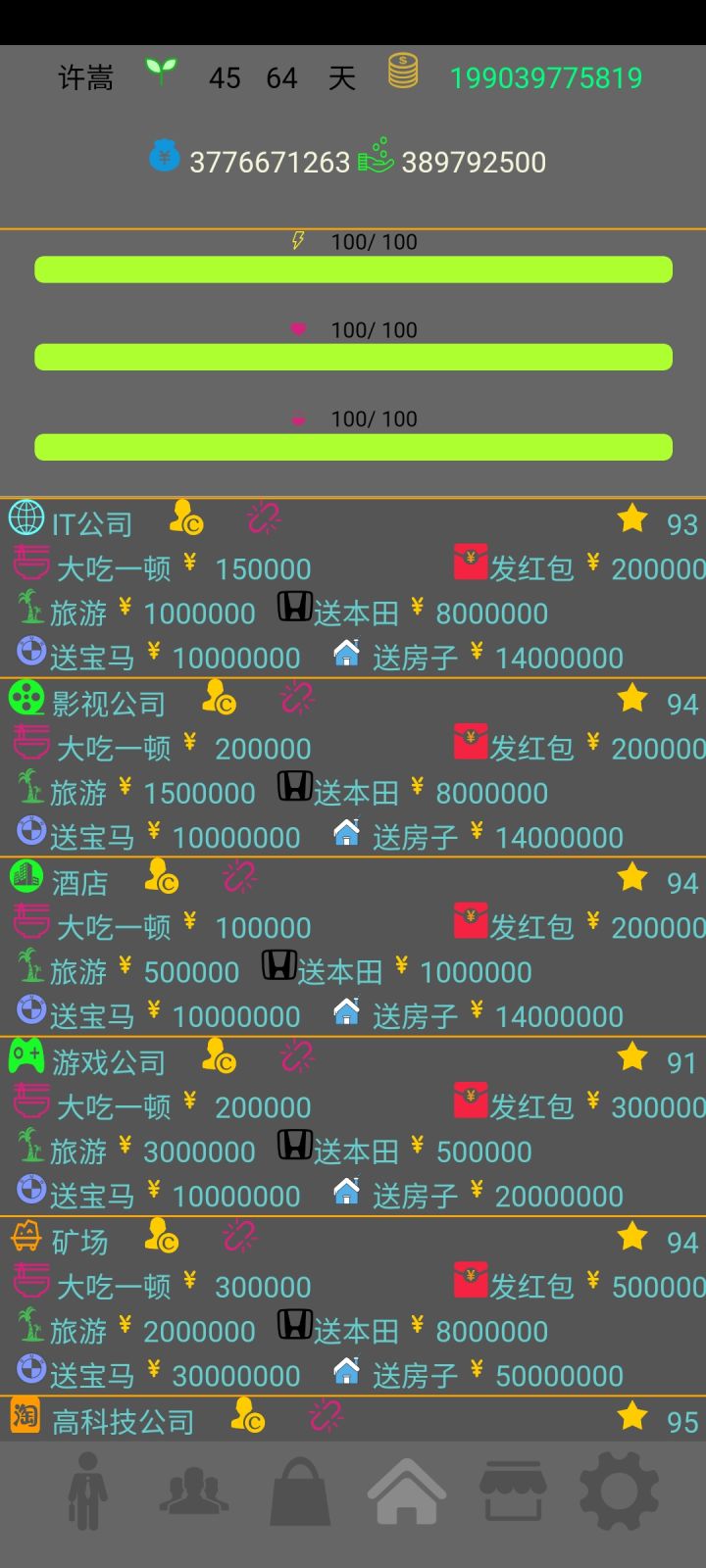 游戏下载完更新完再玩!欢迎加入未来人生交流群:655250142未来人生是由未来人生工作室开发的文字模拟人生游戏。生活:方式1:你可以上班赚钱(不推荐,因为玩久手酸)方式2:创业赚钱, 你可以体验当老板的乐趣,忧愁和快感重点说一下,开公司别随便开,这是根据现实设计的, 你什么也不懂突然去一个新的行业开公司当老板,肯定亏死咯。 看评论很多人说开公司亏成马, 可以联想一下实际,另外,公司的盈利
