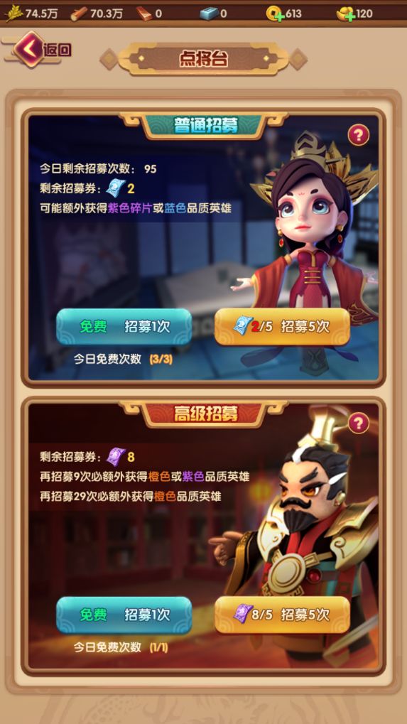 英雄招募英雄获取及养成是增强君主实力至关重要的一环。本游戏中,君主可以升级英雄各项数值,大大提升自己的战斗力。一、获取途径1、点将台招募点将台是您获得英雄的地方。在这里您可以通过普通点将和高级点将以一定概率获得英雄,助您争战沙场,无往不利。2、合成英雄碎片(魂)3、不定时活动中赠送温馨提示:点将台有几率获得英雄和英雄碎片,英雄碎片也可通过副本、各种活动获取。二、英雄属性英雄品质英