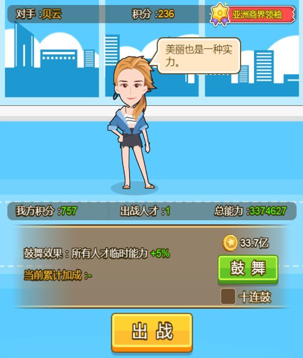 作为一名高贵的首富,在商战中唇枪舌剑、你来我往自然是习以为常。如何在商战中无往不利呢?小秘书在这里给大家分享一波攻略~【出战阵容】首先,我们要派遣自己最强大的人才队伍去碾压对手,没有培养过的人才就不要派上去送分了。橙色的人才有自带PK技能,对本职业的人才有额外加成,因此橙色人才带队是个不错的方案。【人才鼓舞】出战时,如果金币充足,花点金币鼓舞一下人才,队伍的总能力能得到提升,就能增加几分战