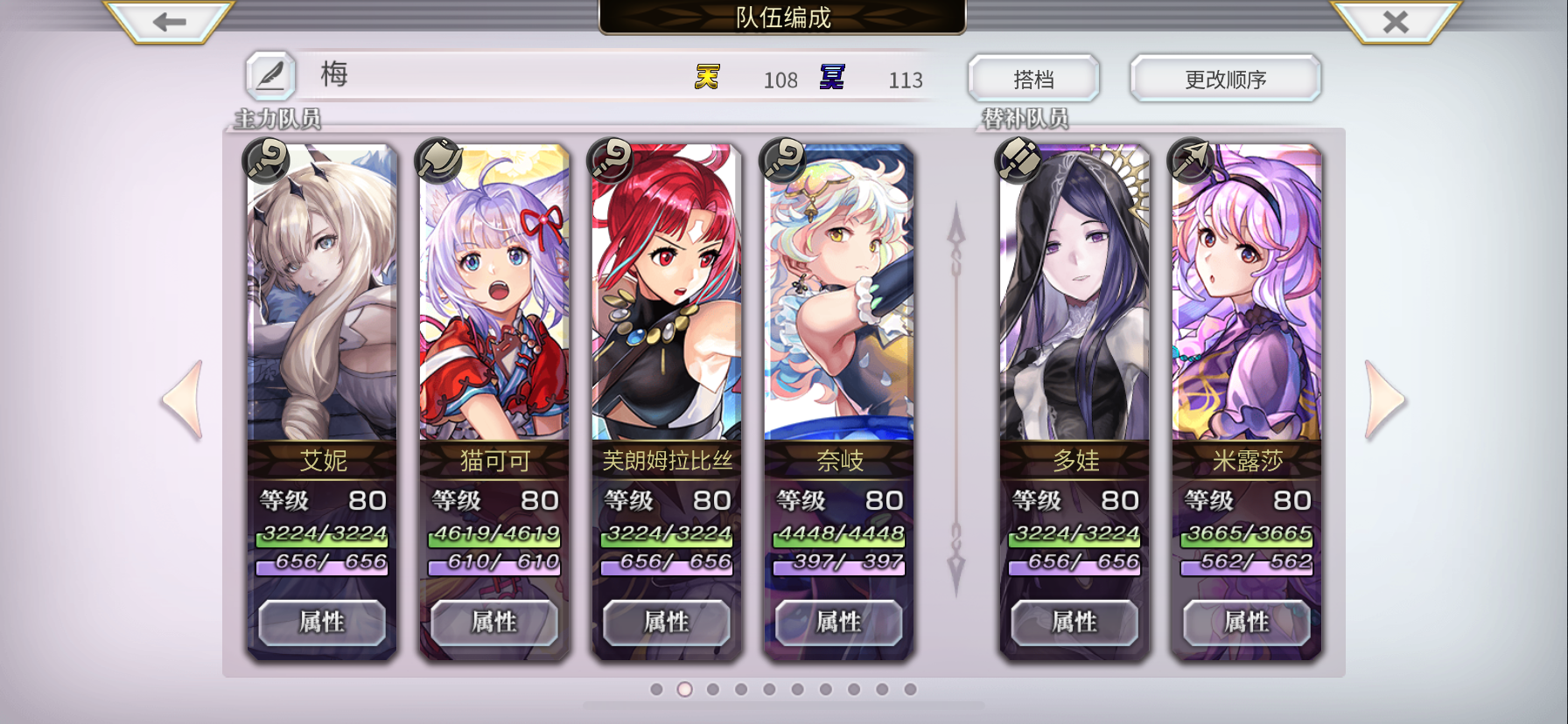 有燕子不用的我会伤心的好吗?(玩个梗hhh) 阵容是猫可可、as公主、狼弓、as燕。老师是半个灵晶架➕凑天值的,魔兽妹挂着升冥。 这个阵容是对我来说比较好用的一个能凑够天值➕1t的阵容,因为没练稻草人,水拳的天值又太低,只能拉之前未东天值升到126的老师来凑数。 徽章武器技能:除了燕以外,前排所有人都要带速度徽章,保证速度比燕高30以上才能稳定不被超车。猫可可用精灵惠那个技能给燕提供地伤,狼弓上痛