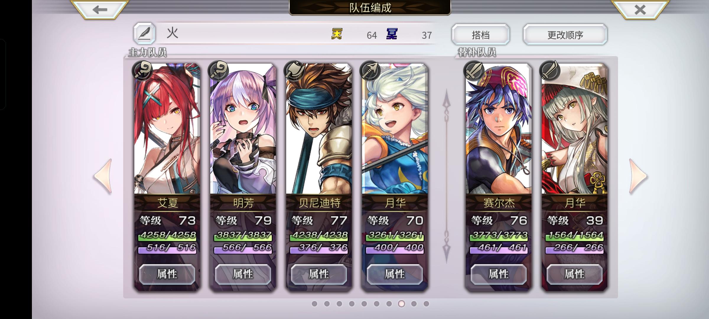 能打的就这几个,斧子哥输出,月华鼓舞转属性和加buff,艾夏开阵上毒痛,明芳开保护和加buff。之前不带明芳角色总是被打死。意外的感觉挺猛,斧子哥好牛。