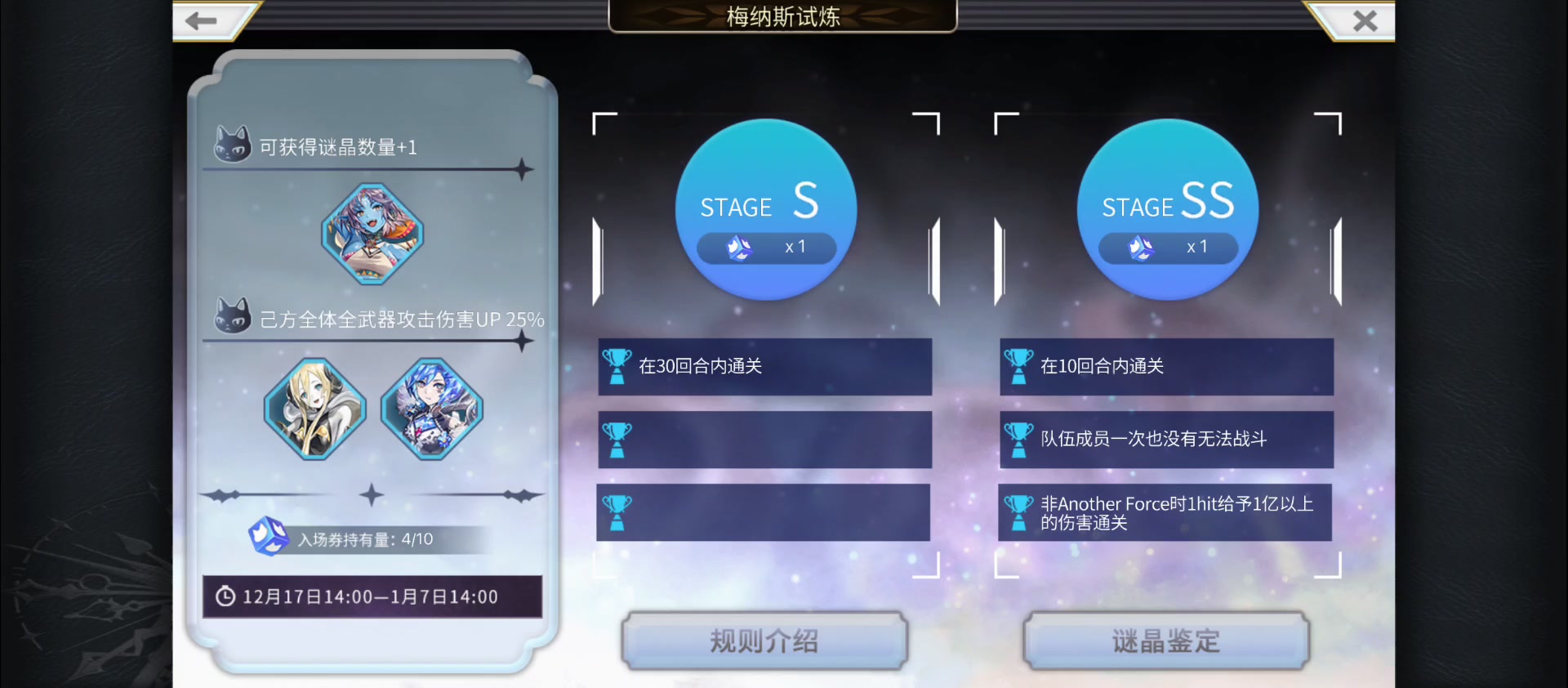 视频太长只减了最后一条命。这号才玩13天,积累太低了。 上个号玩了近1个月,有艾妮,后面抽到仙华,梅纳斯都不配让我研究,稀里糊涂打个双s[表情_嫌弃]。可以第一次玩不太懂,把钻都嚯嚯光了,看着一堆上古老baby,我悟了,重开吧 内容都在视频里面,虽然最后没拿到谜晶,不过打赢还是挺爽,[表情_坏笑]对萌新攻略可作参考。 伐木哥今天才做的,两个送的毒痛,一个狙击矿,无属性灵晶一个,一个虚空斧头p化。实