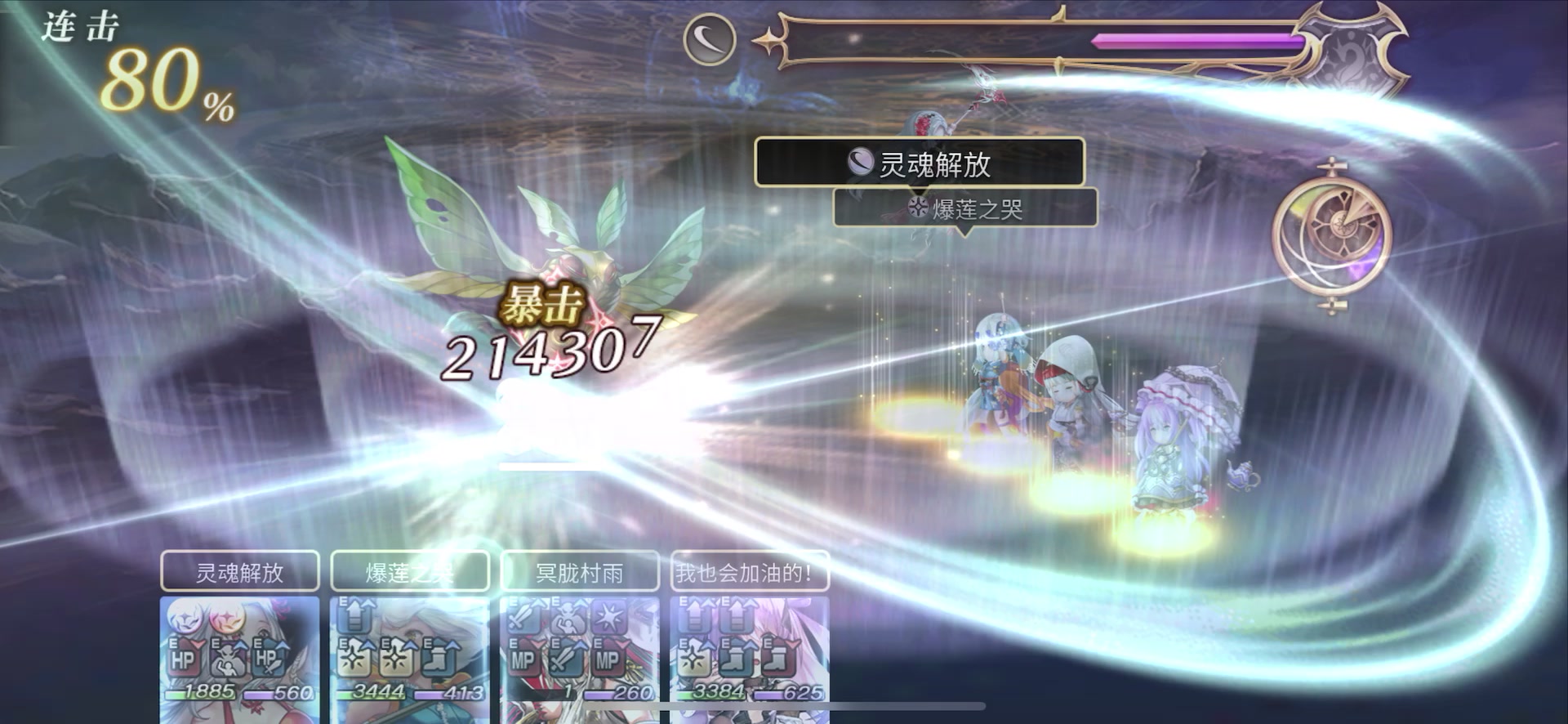 大姐姐月华也觉醒了,不同于小妹妹月华的纯辅助定位,大姐姐月华更加偏向于输出手。 视频如下: 配置如下: 说实话这个轴阿鲁多有点抢风头了(男主角的含金量),我也是打完才发现这个问题,不过也懒得换新的打了,想看月华高光的直接去找歪仁打大祸时的拒绝[表情_斜眼笑] 下面简单介绍下觉醒后的月华: 1,战斗开始时自动附加疯狂之力舍身,以及一次坚持。不懂疯狂之力是啥的,请参考: 不过正常来说,只有雷阴晶角色才