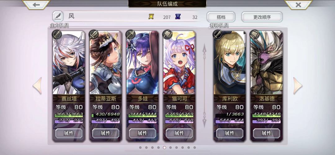 由于没正式玩过, 目前只是一个分析帖! 问了下,狼姐不自带毒疼,那么一动上面队伍依法和雷刀可以下了(雷刀也可以当灵晶架,放后排)! 根据狼姐特性前排四风属性就行。 道中我想应该没问题,吸收和无效那就没法。 副本目前3.0虚时层应该随便打。 一动伤害不够,那可以上依法,一键祝祷! 副本我记得风属性应该都能打。(有吸收或者无效,请告知。) 问题来了。 日常平行迷宫非常困难保证120天冥即可!(需要天或