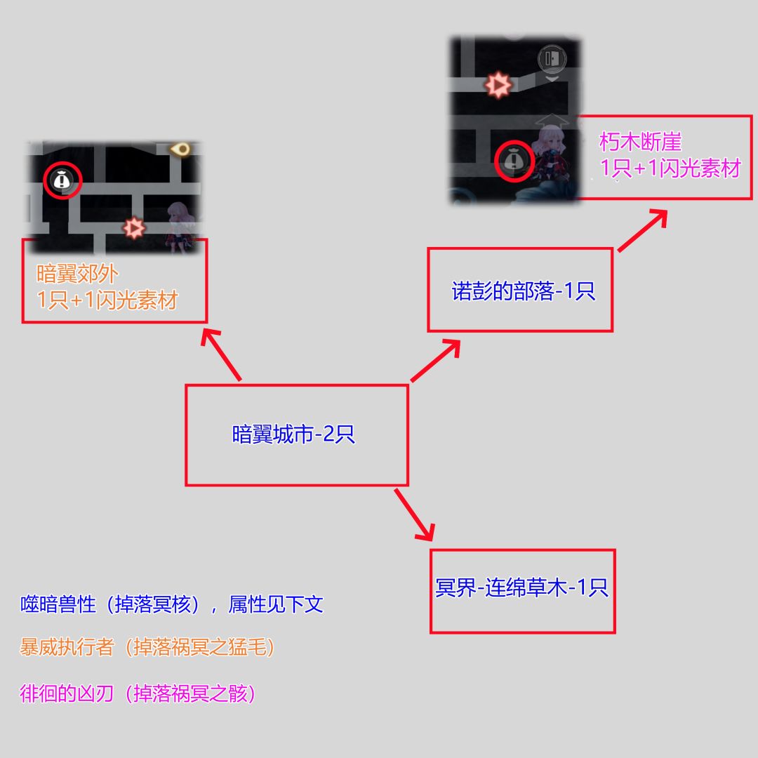 国服尚未更新 国服尚未更新 国服尚未更新,预计更新时间见2楼评论区 一圈需要打6只怪+定点拾取2个闪光素材 4个相同小BOSS产出冥核 2种Fear 掉落不同材料 Fear所处地图中,会各带2个闪光素材点,里面包括一个随机的fear材料需要拾取(位置固定,上图红圈标注位置) 带遇敌DOWN打完上述六只,把难度调最低,换成遇敌UP在野图再刷一刷小怪素材就足够了 升级后的武器属性,以剑为例: 物攻/魔
