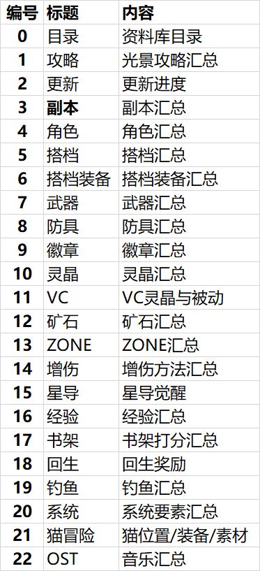 资料库链接: 由于csdn直接复制排版混乱(),改用腾讯文档,再加上“○○使用建议”一直少汇总表,于是经过半个月整理,就有了这个。因为是我一个人整理,命名为光景资料库,暂不提供下载,发现错误可批注。转载随意,但不保证没错。 一、资料库 目前有22张表,简单介绍一下 1 攻略 光景攻略汇总,因为链接太多,以表格形式放在文档里 最新攻略会写在腾讯文档,建议收藏资料库,需要时查阅 2 更新 最新的更新情