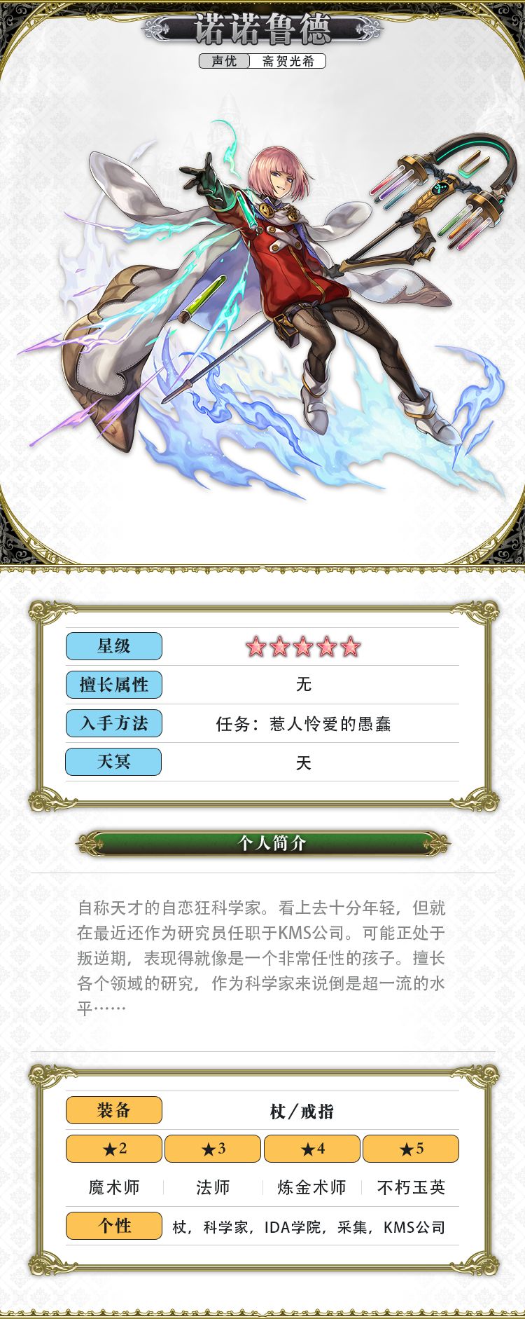 角色获取: 星之梦见馆抽卡获得★4诺诺鲁德 角色进阶: 完成主线剧情第18章 完成诺诺鲁德角色任务2:「共度的时光」 通关外传:「绝对零度之锁」 在IDA学院H栋入口可接取任务「惹人怜爱的愚蠢」,最终解锁诺诺鲁德★5,并获得“不朽玉英之书”×1、“不朽玉英之证”×3 角色觉醒: 修复星咏书架豪杰篇「绑架机器人之书」获得“不朽玉英之星谱”×3 辅助能力汇总(非自身增益及对敌减益) 力量UP、智慧UP
