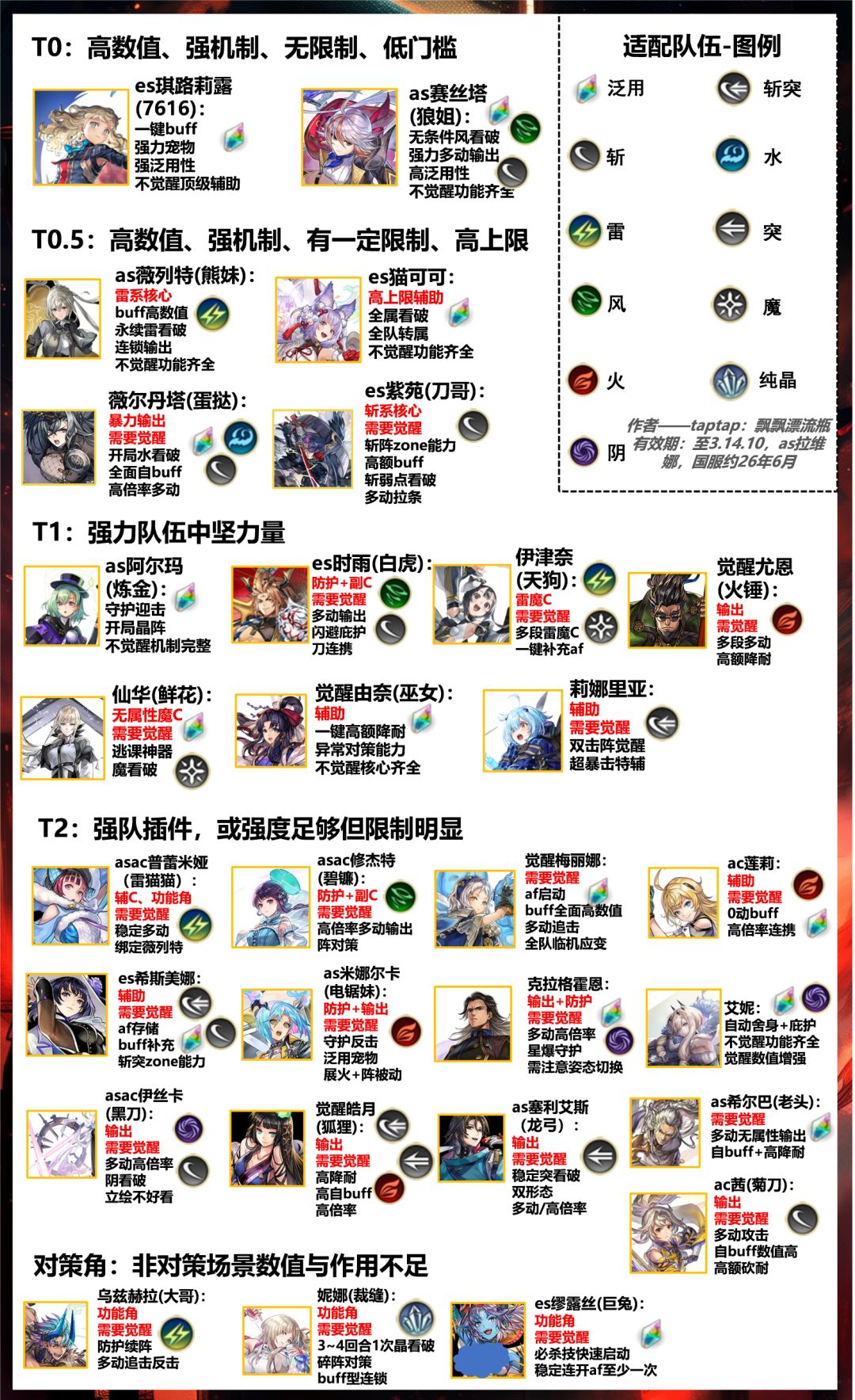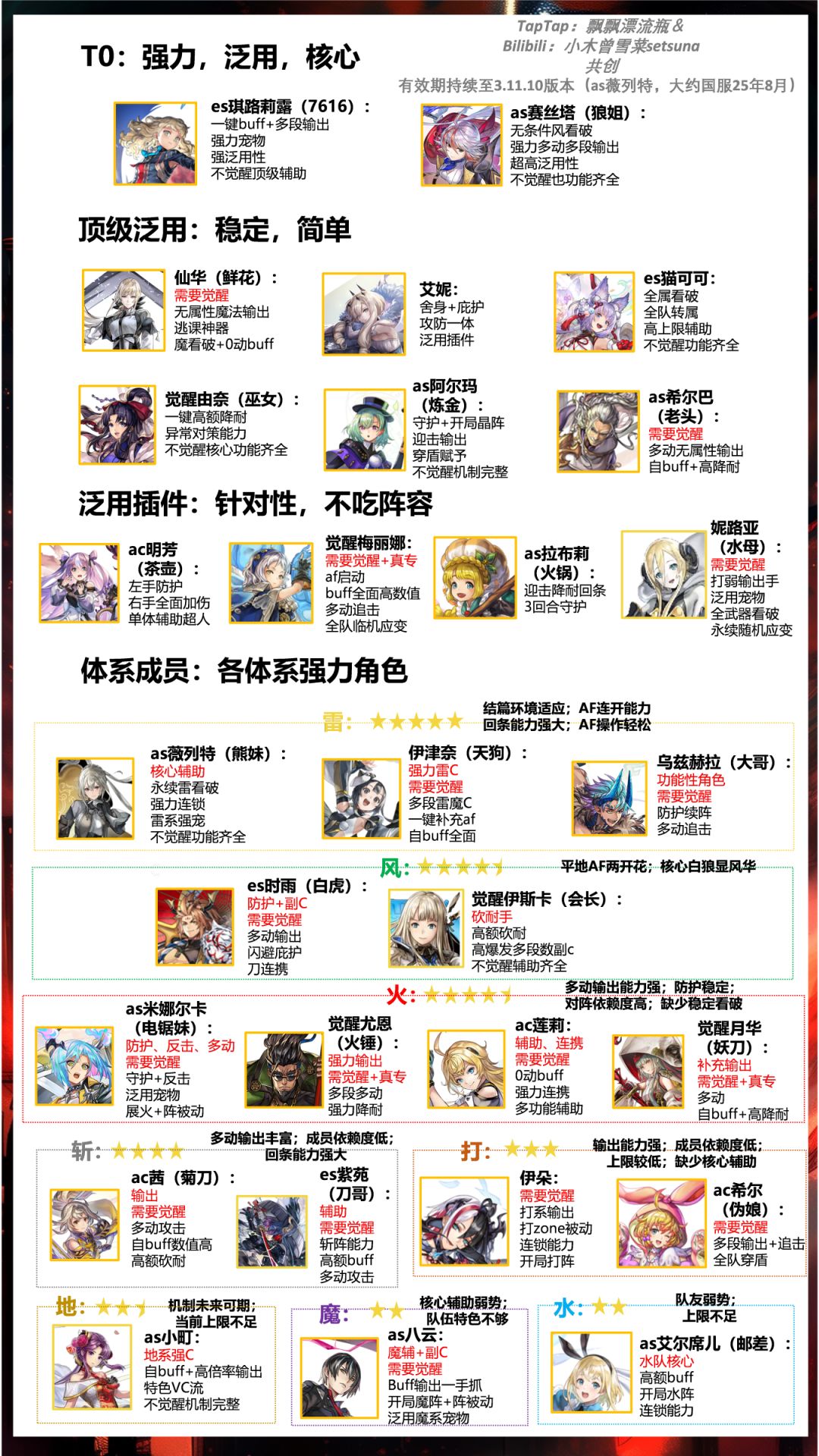 考虑到刚入坑的新人,本攻略将不再赘述具体数值,而是直接评价 希望大家不要有强度焦虑,这个我只是方便新人参考的,快乐游戏,喜欢即为最强 T0 艾妮 阴、火 魔 机制怪 顶级泛用辅 阴队核心 新人友好 日常攻坚都好用 觉醒仙华/鲜花(国服未实装)无 魔 机制和数值怪 新人友好 方便逃课 爆炸输出 觉醒es琪路莉露/7616 晶 斩 数值怪 新人友好 顶级泛用输出加辅助 觉醒as阿尔玛/炼金 晶 突 机