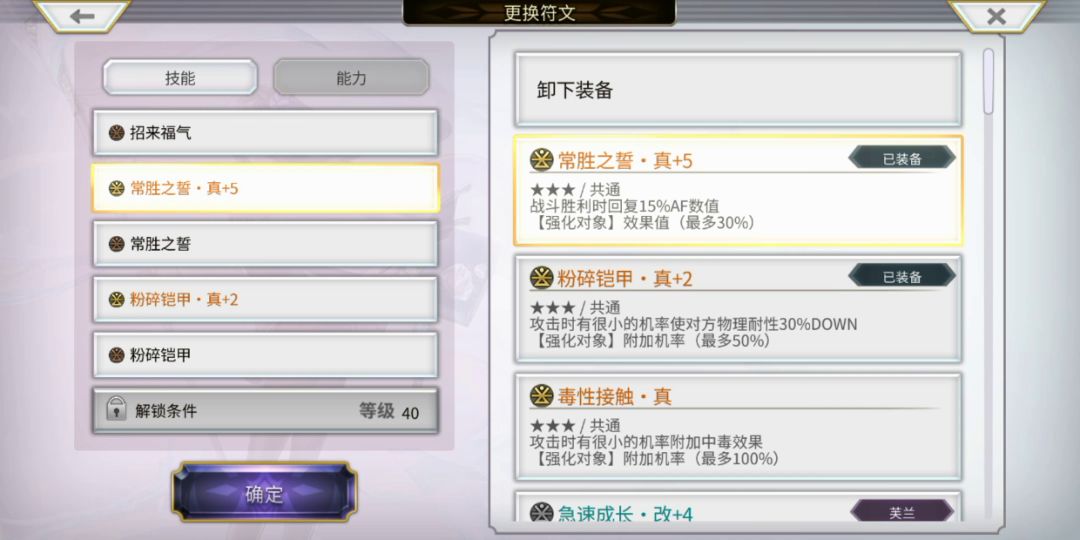 【核心思路】 设定一个常胜之誓-真+5,每场战斗结束会获得60点af条,还需要一个常胜之誓-改+5即可实现每一轮战斗都拥有Af条。如下图所示。 【角色符文的选择以及战斗思路】 建议带三个攻击型角色加一个支援型的,三个攻击角色不要带同一种武器,斩打突各带一个,这样只要刷出金色的符文就可以用了,刷到哪个就用对应武器的角色当输出,放一号位,支援角色普攻或者带一个能打伤害的技能打条就行了,无弱的情况下一号