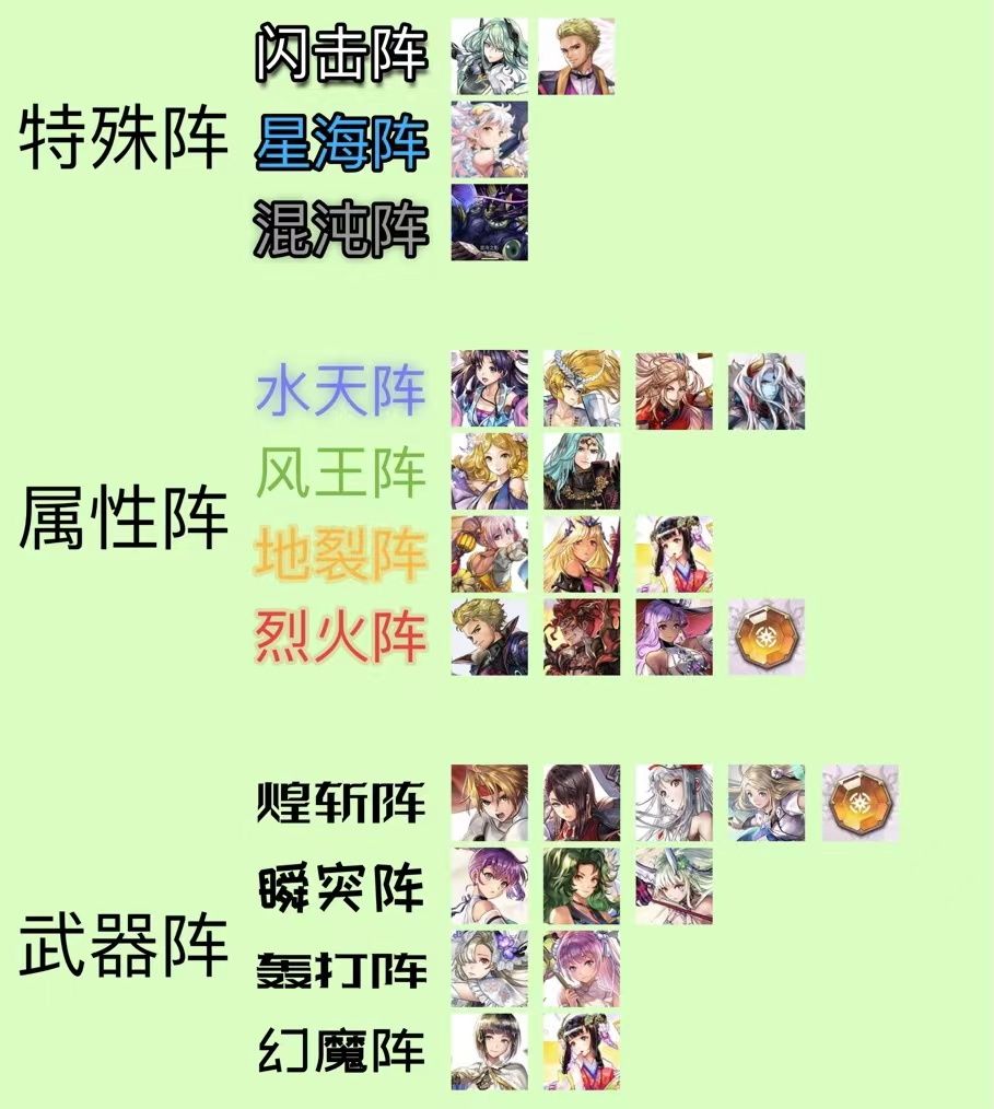 附加文字版,统计了阵角VC技能和灵晶强化后效果,以及开阵被动效果,时间:2022/9/25。 特殊阵 闪击阵:伤害提升30%,回复效果提高30%,AF打条变为+20 1,梅丽莎 开阵被动:只在第一回合展开闪击阵 2,AS哈迪 开阵被动:只在第一回合展开闪击阵 星海阵:AF打条变成+15,AF条蓄满后我方伤害提高2倍,开AF后失效 1,ES奈岐,VC:星海阵+物耐30%UP(1回合) 证强化后:物理
