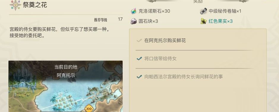 另一个伊甸花的任务指的是祭奠之花任务剧情,这个花任务剧情完成需要的步骤很多,任务进行起来也比较繁琐。进行花任务的完成时,步骤不能出错,回答问题时选择的的答案也不能出错,出现失误后很容易就导致任务无法完成。 想要完成祭奠之花任务剧情,首先要前往帕西法尔宫殿2楼领取任务,然后向帕西法尔宫殿的侍女长询问鲜花的情况,将对应的口信带给侍女,再在阿克托尔处购买鲜花,最后将鲜花交给侍女就完成了。 购买鲜花时,遇